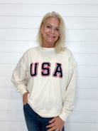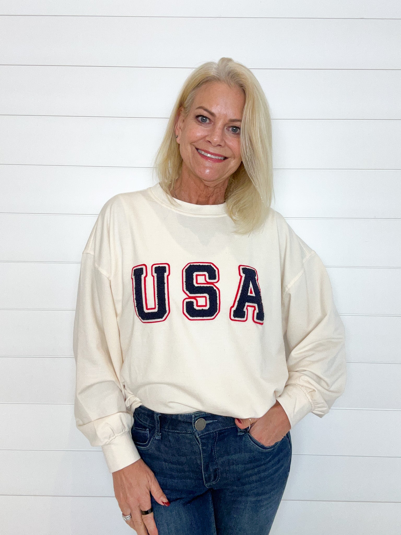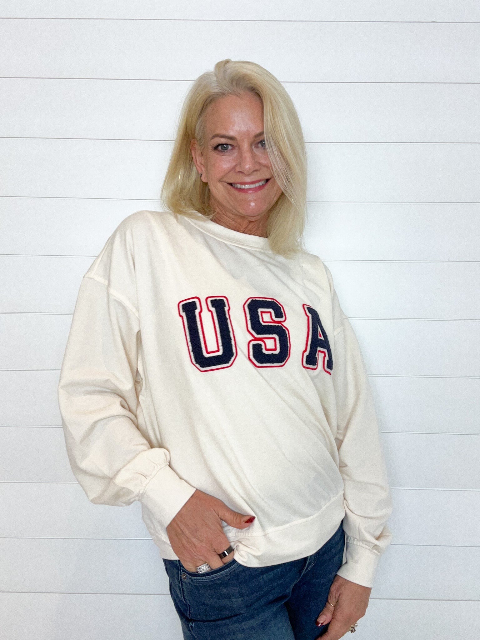 Show your stars-and-stripes spirit in the USA Varsity Knit Top — the perfect mix of sporty and cozy. With its relaxed fit, drop shoulders, and bold varsity lettering across the front, this easy pullover brings casual-cool vibes to any day of the week.