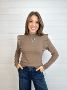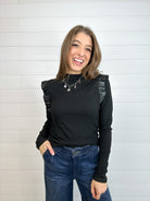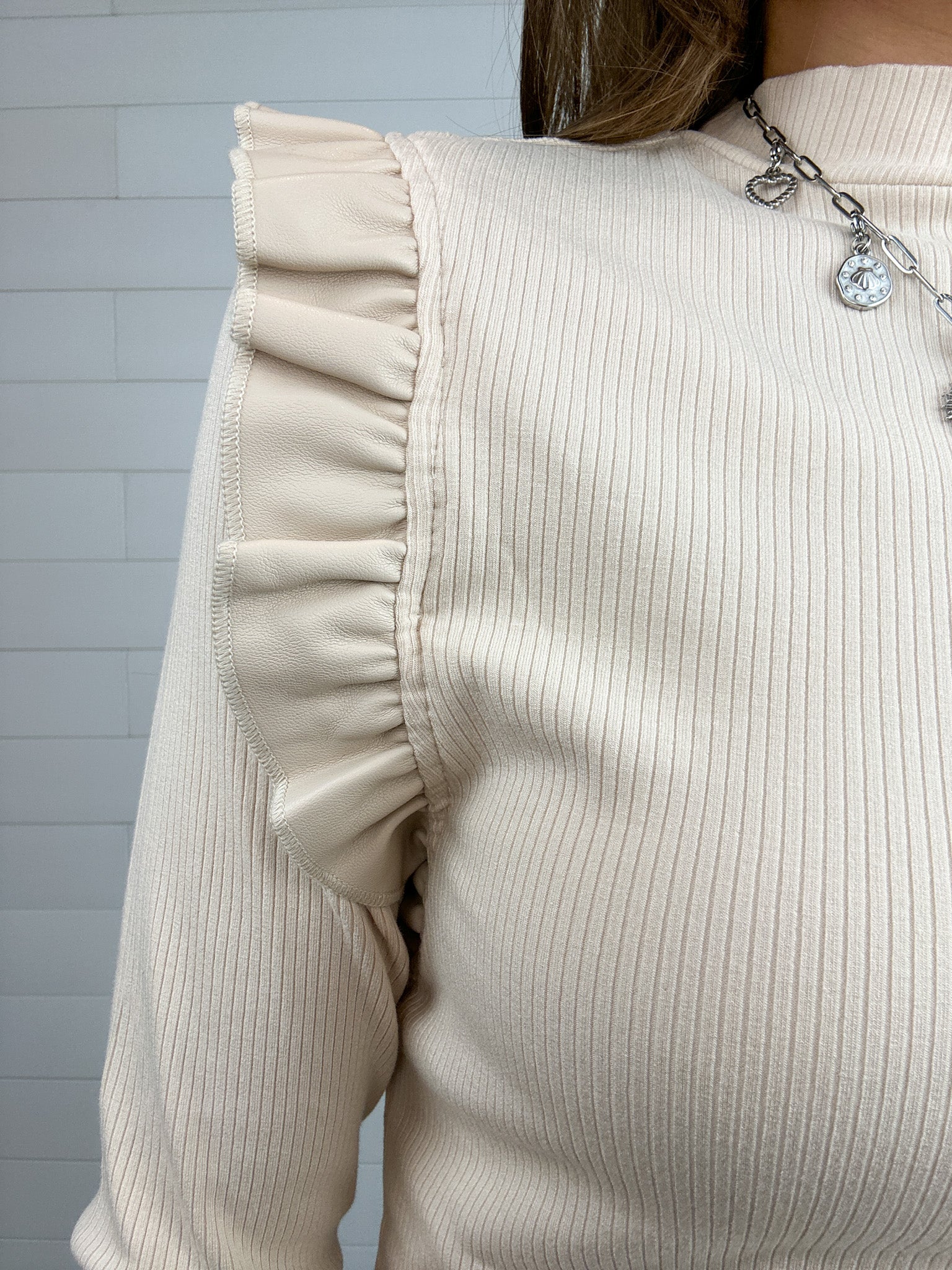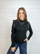 A little sweet, a little bold—the Vegan Leather Ruffle Trim Top is the perfect mix of feminine flair and modern edge. Crafted in a soft, stretchy knit with a mock neck and ribbed texture, it’s finished with vegan leather ruffles at the shoulders for a chic, unexpected twist.
