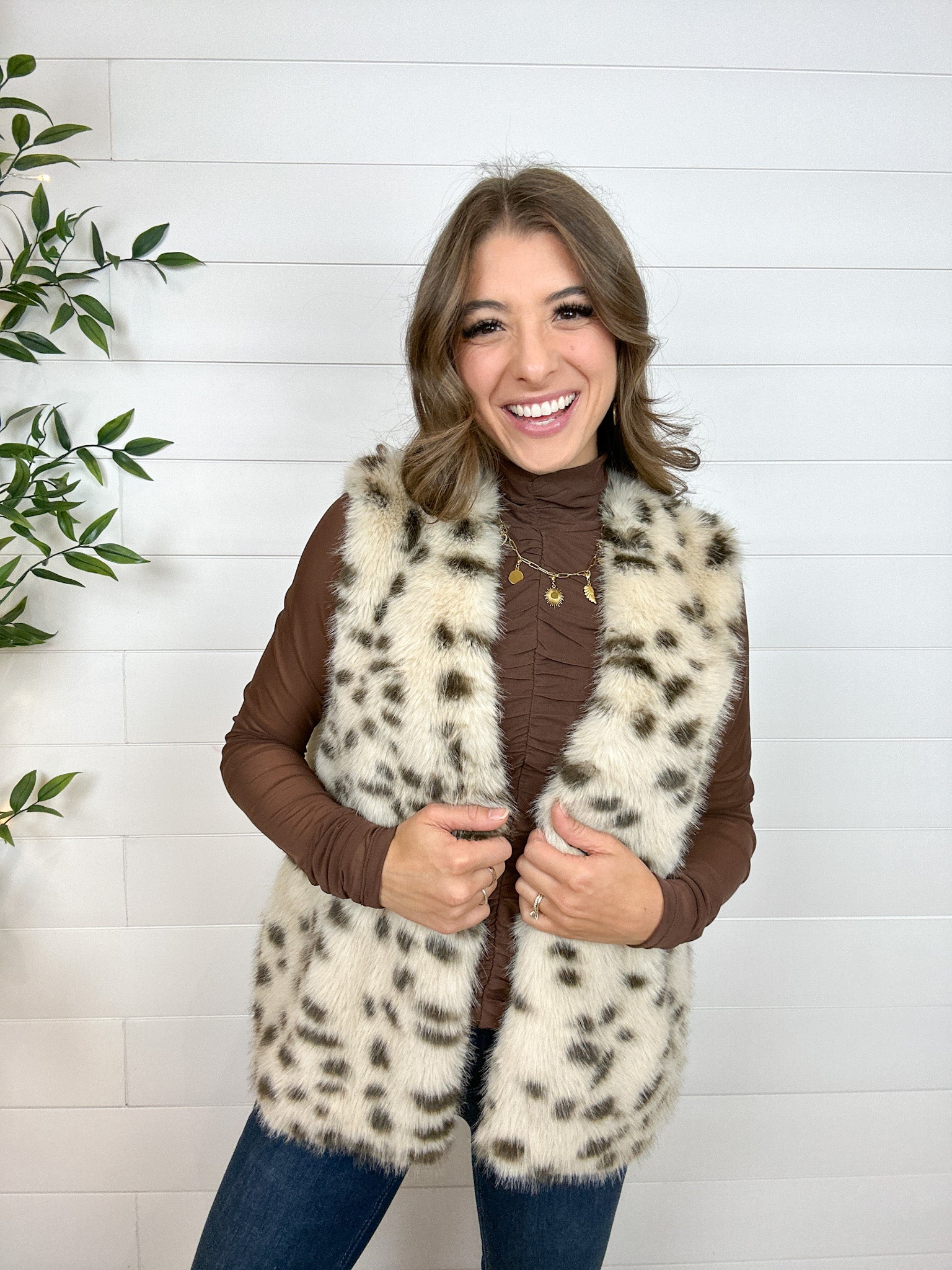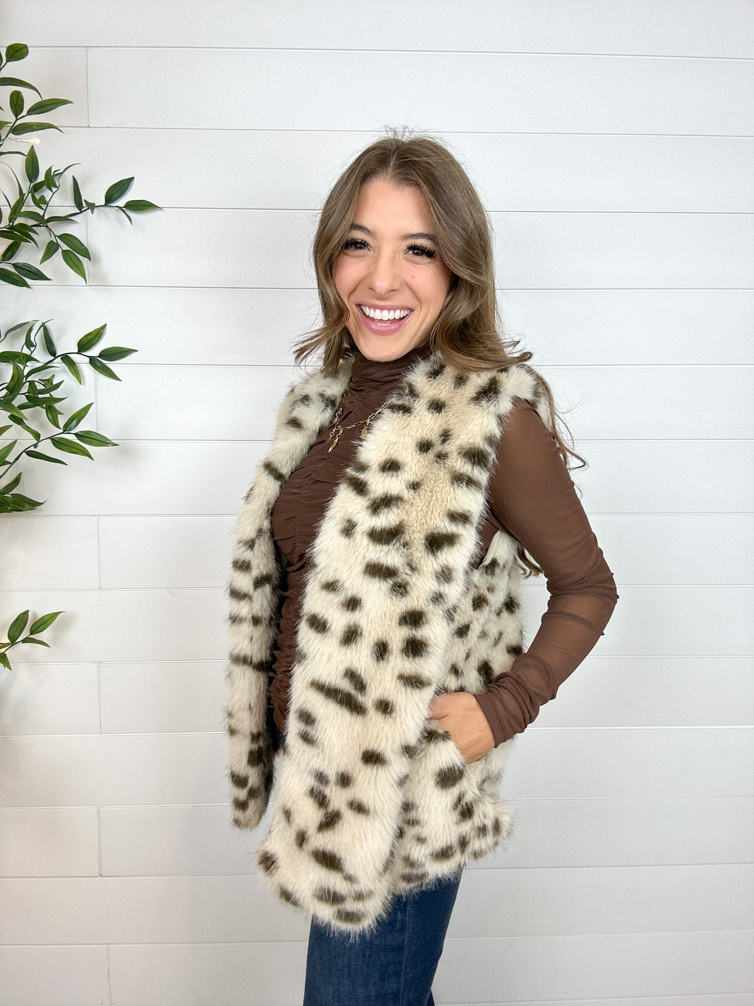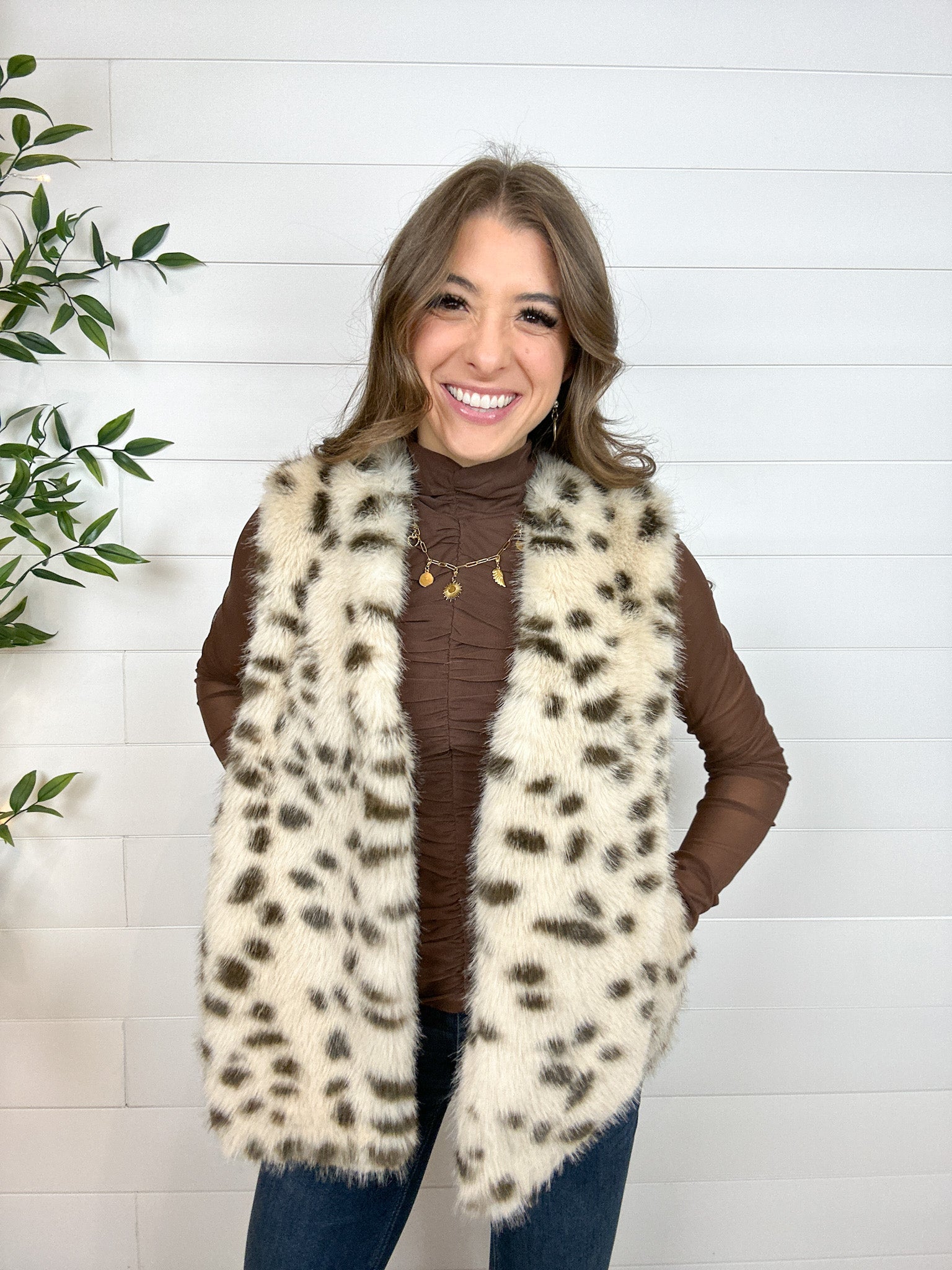 Turn up the cozy and the glam with this Animal Print Fur Vest! Featuring a soft spotted faux fur and a relaxed, open-front fit, itās the perfect statement layer to toss over your favorite sweater or long-sleeve tee. With handy side pockets and a luxe feel inside and out, this vest makes every outfit feel a little more fabulous.