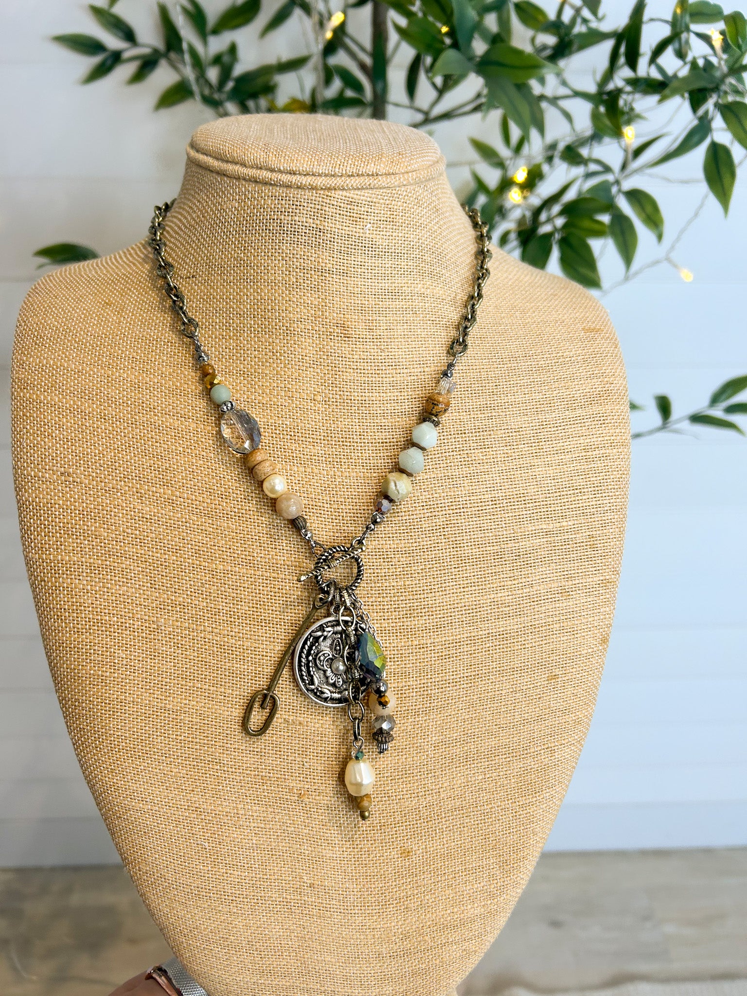 This pendant/charm necklace is a striking blend of design and craftsmanship. The necklace features a front toggle adorned with intricate beadwork, coin, and chain dangles, each element adding a distinct flair. Wear it to add a touch of uniqueness to your ensemble.