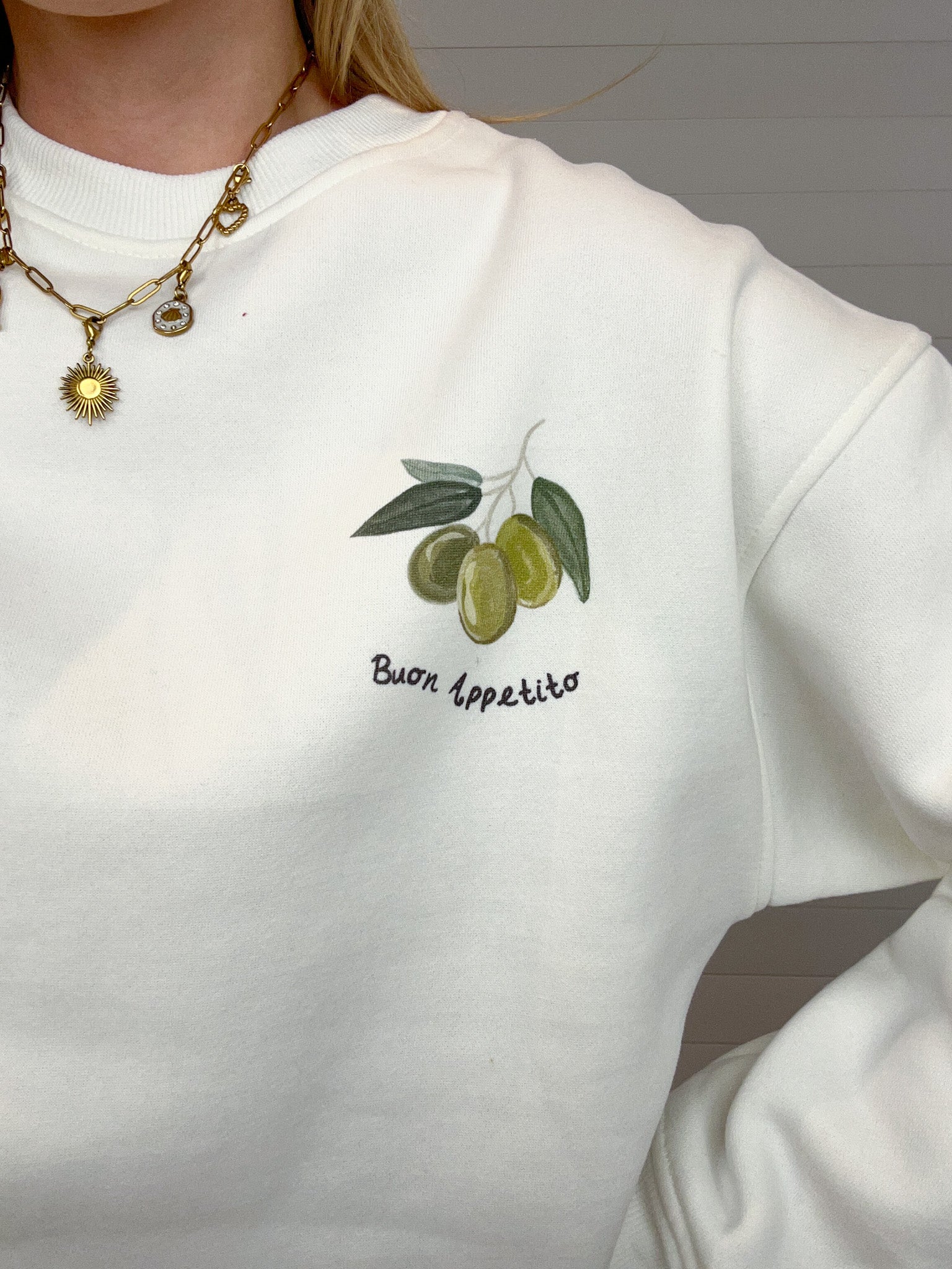Small “Buon Appetito” & olive graphic at chest