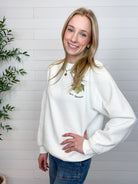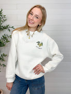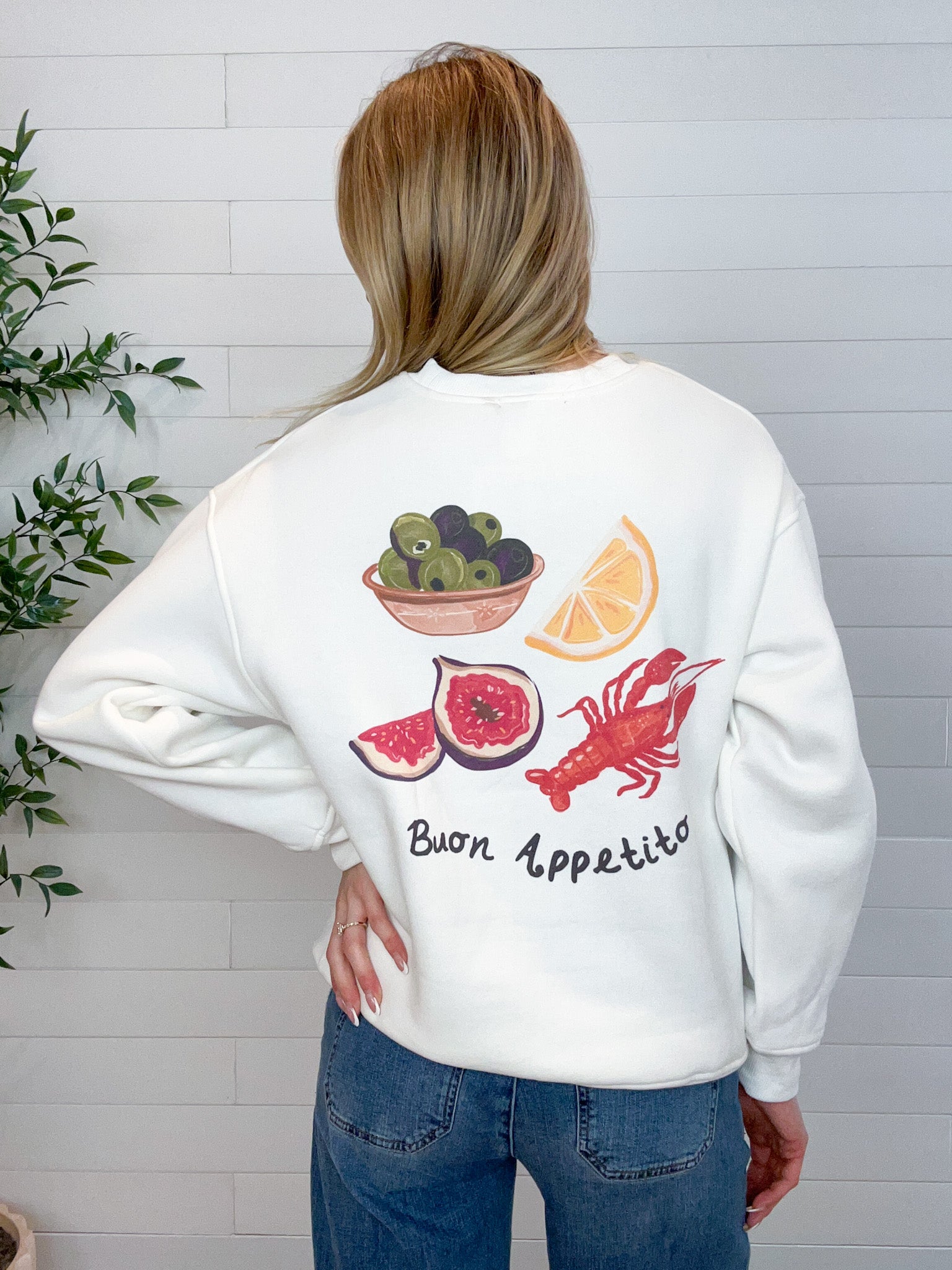 The “Buon Appetito” Graphic Pullover is serving charm, comfort, and major European café vibes. Crafted from an incredibly soft, squishy knit, this pullover feels as good as it looks. The front keeps things subtle with a small olive and “Buon Appetito” graphic placed just like a classic logo, while the back makes a bold statement with oversized lettering and a vibrant food-inspired graphic featuring a lobster, lemon slice, figs, and olives. Fun, cozy, and full of personality — this one’s a total conversation starter.