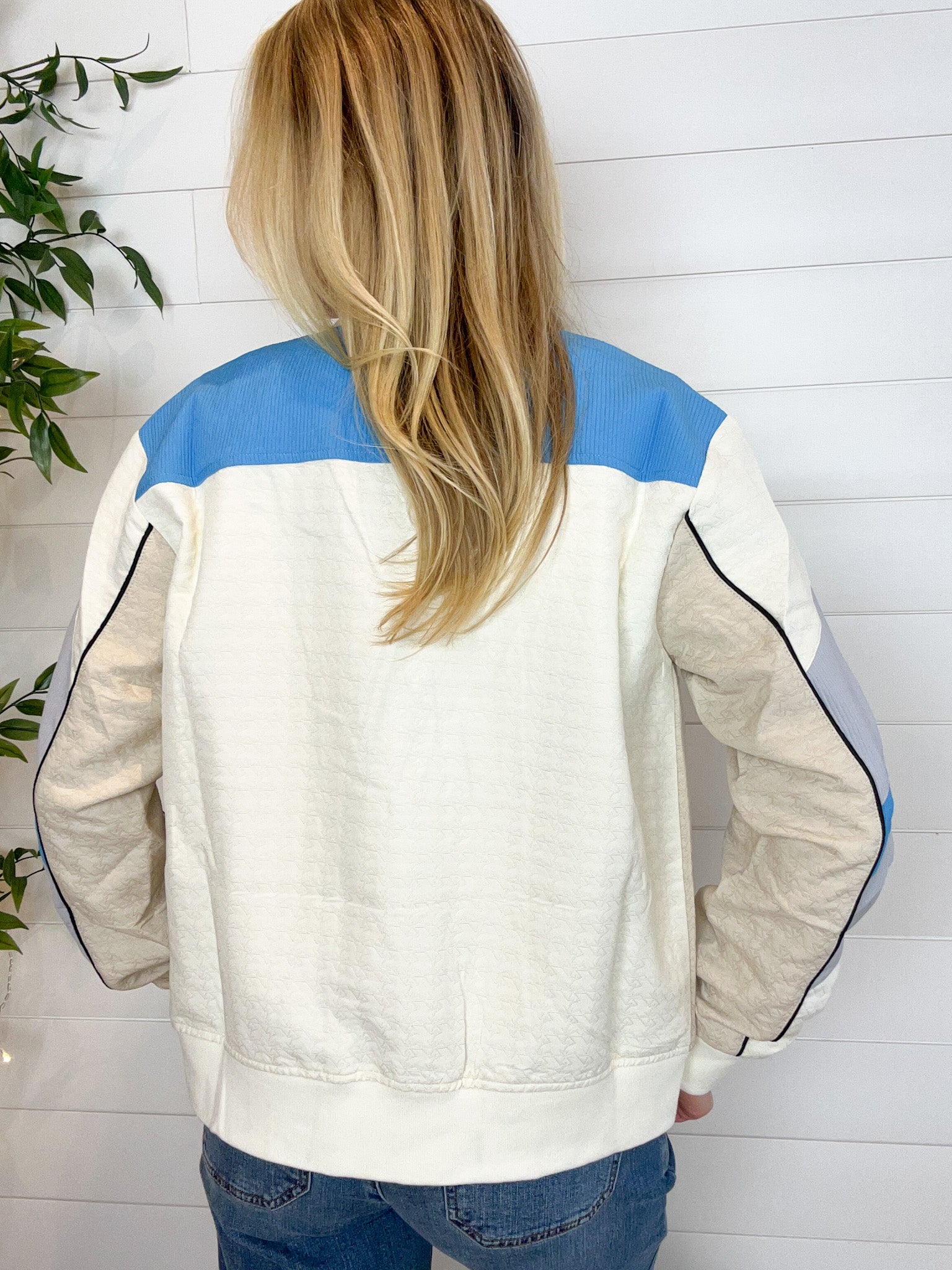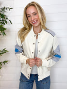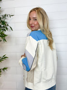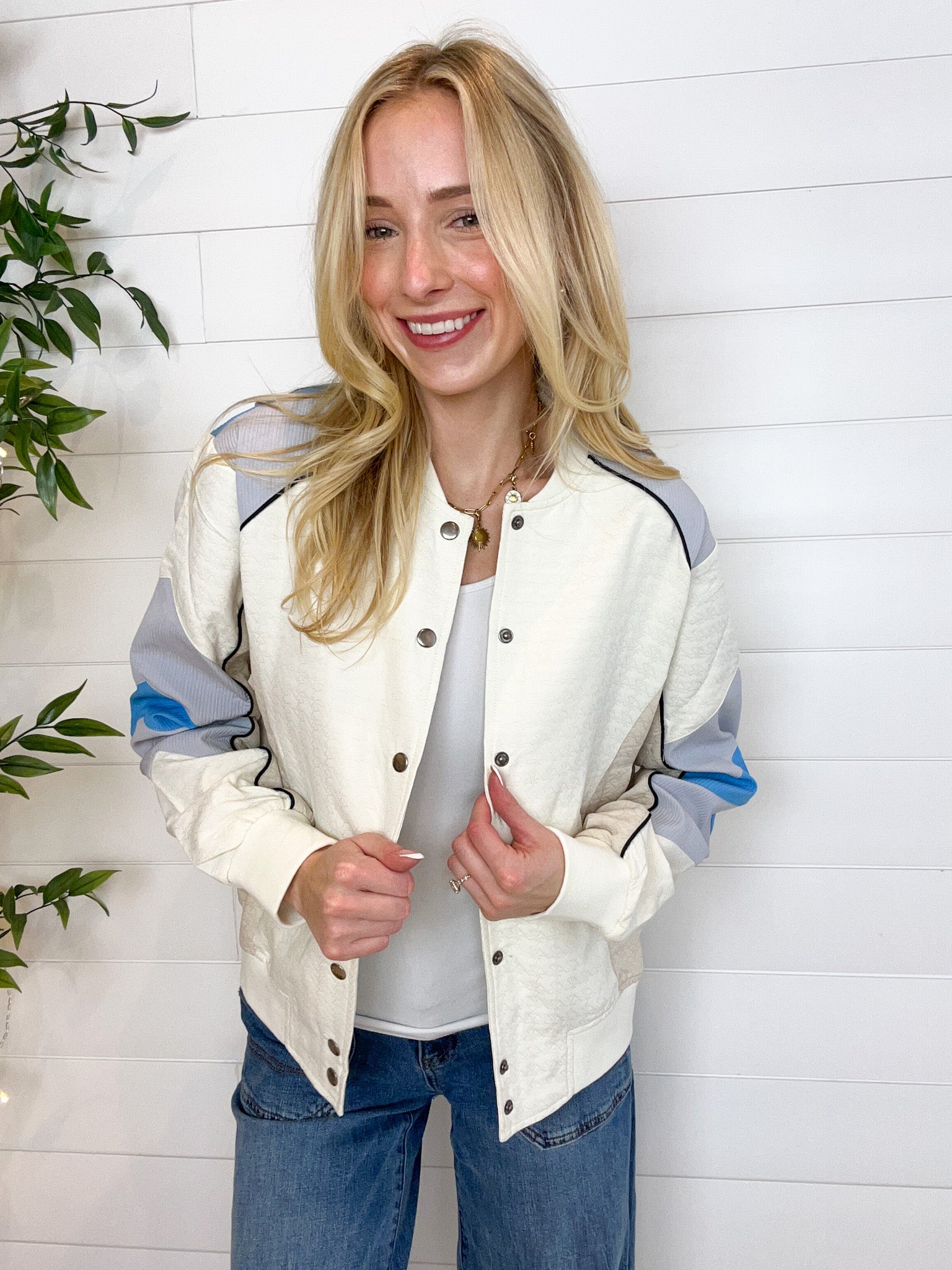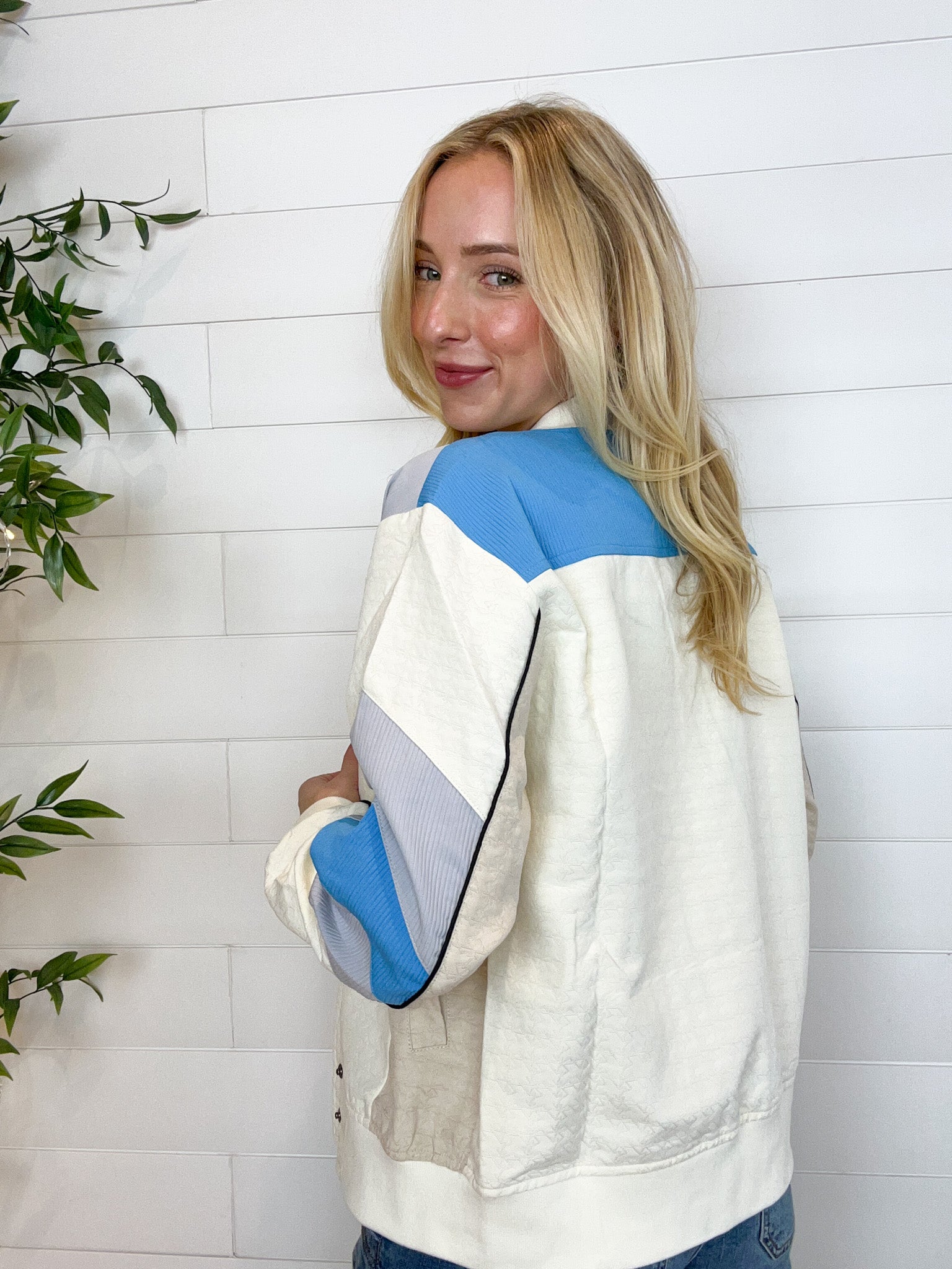 This color block bomber brings bold texture and modern vibes to your everyday lineup. With its zig-zag quilted finish, clean snap-front closure, and sharp color blocking, it’s the piece that instantly makes any outfit look more intentional (and a whole lot cooler).