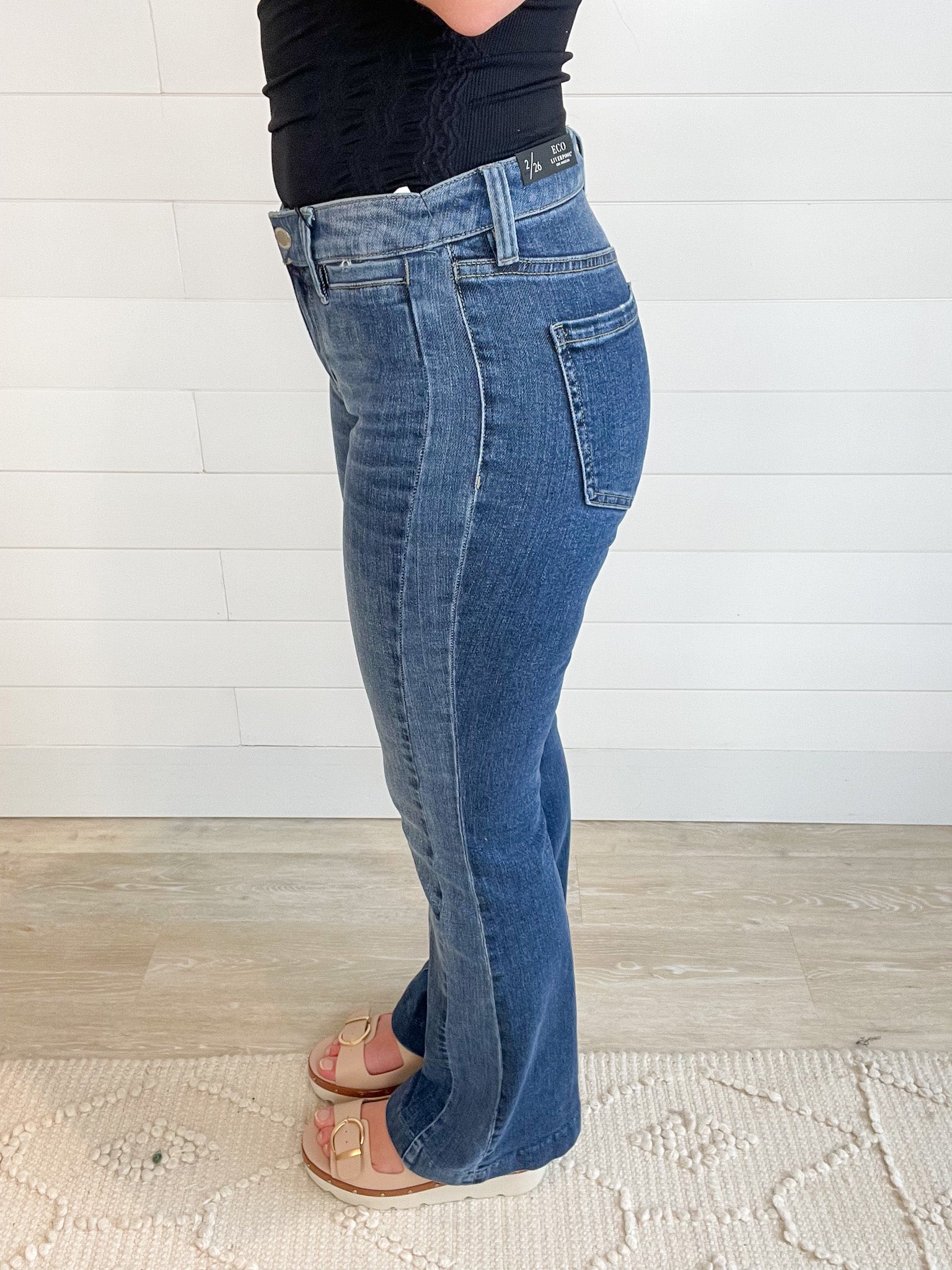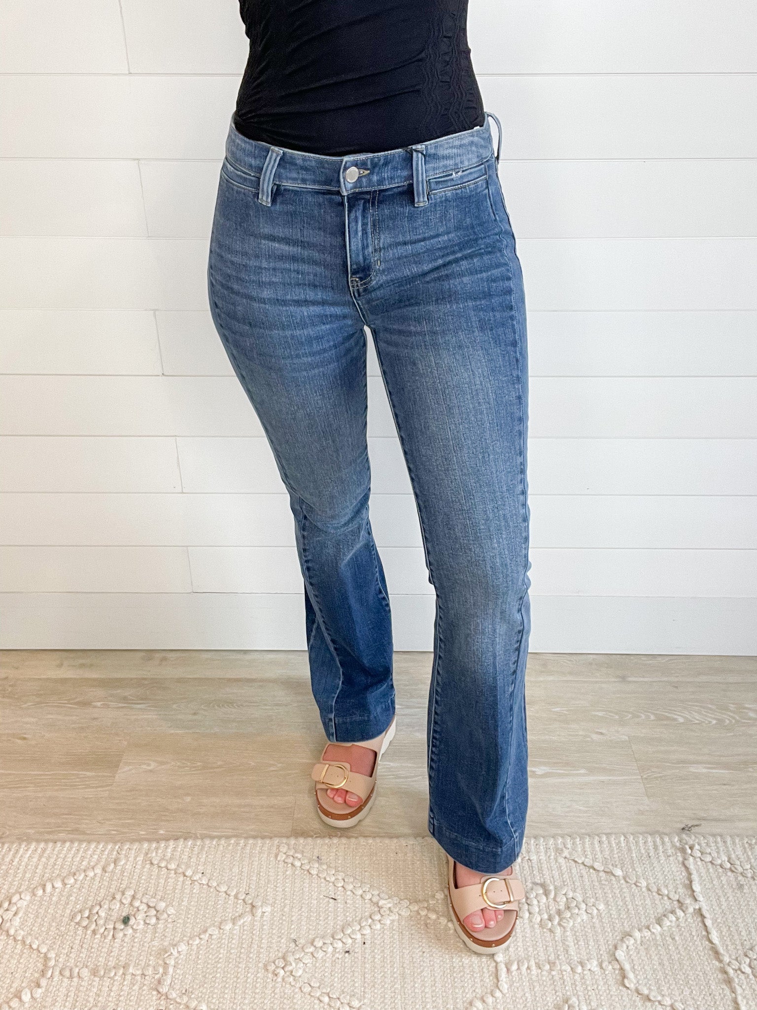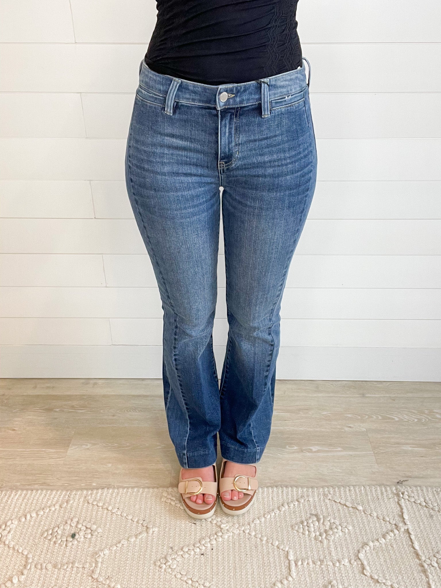 The Liverpool Contrast Panel Hannah Flare Jeans put a playful spin on a timeless silhouette. With a flattering 10" rise and a full-length 31" inseam, these cotton-rich flares elongate your legs and elevate your denim game. A lighter denim panel runs down the outside of each leg, adding contrast and a cool, elongating effect. Just the right amount of stretch makes them as comfy as they are eye-catching.