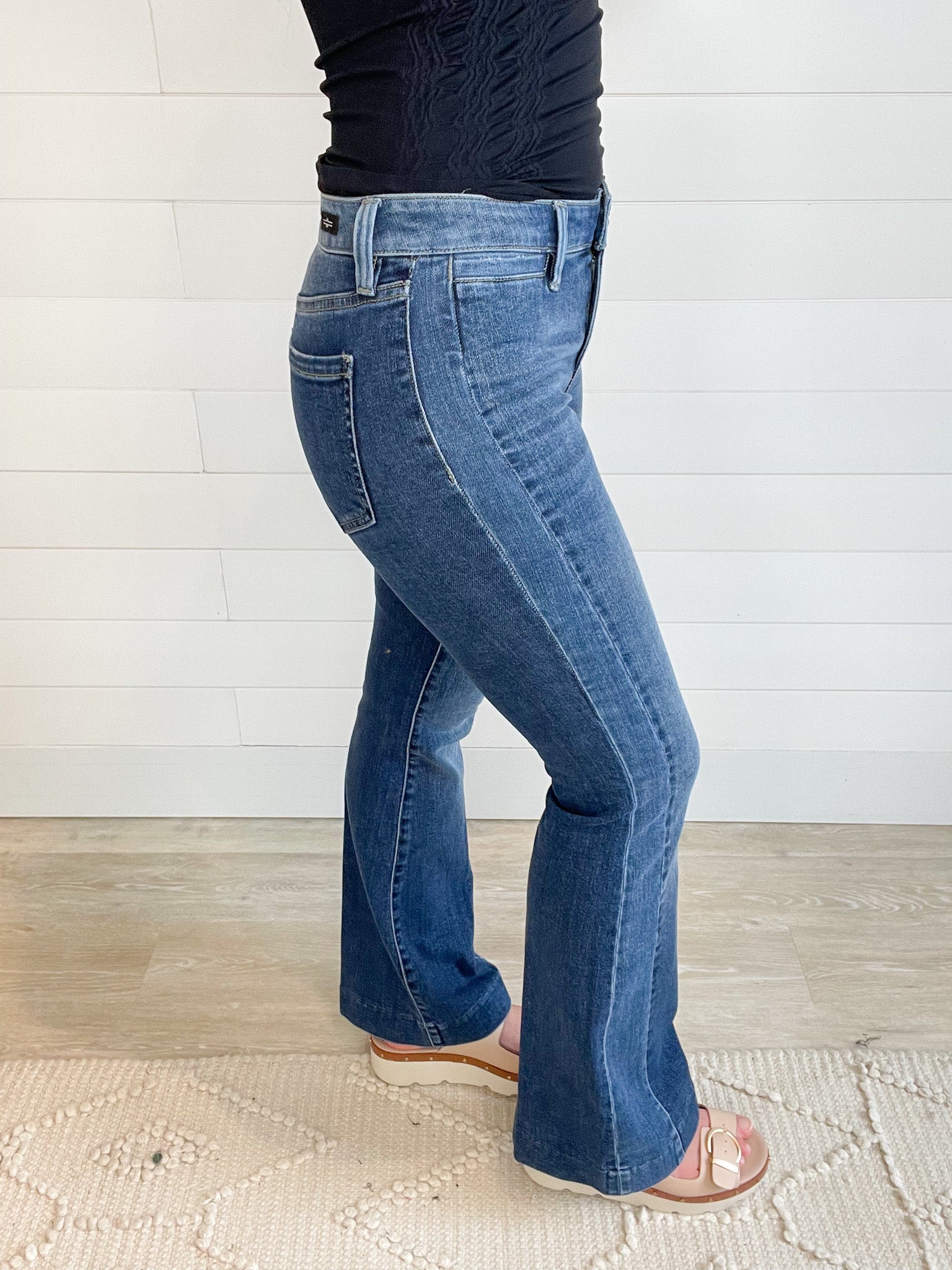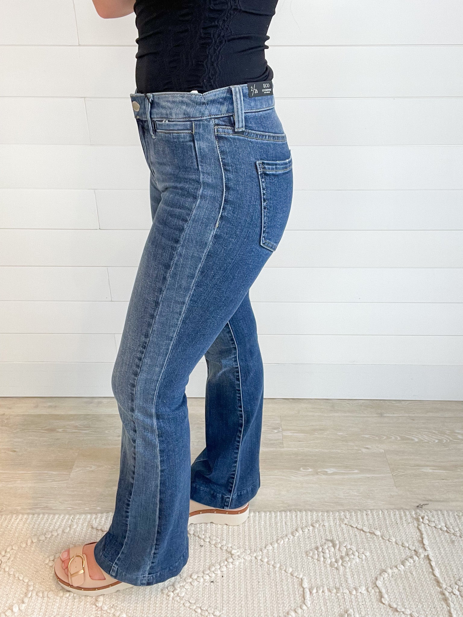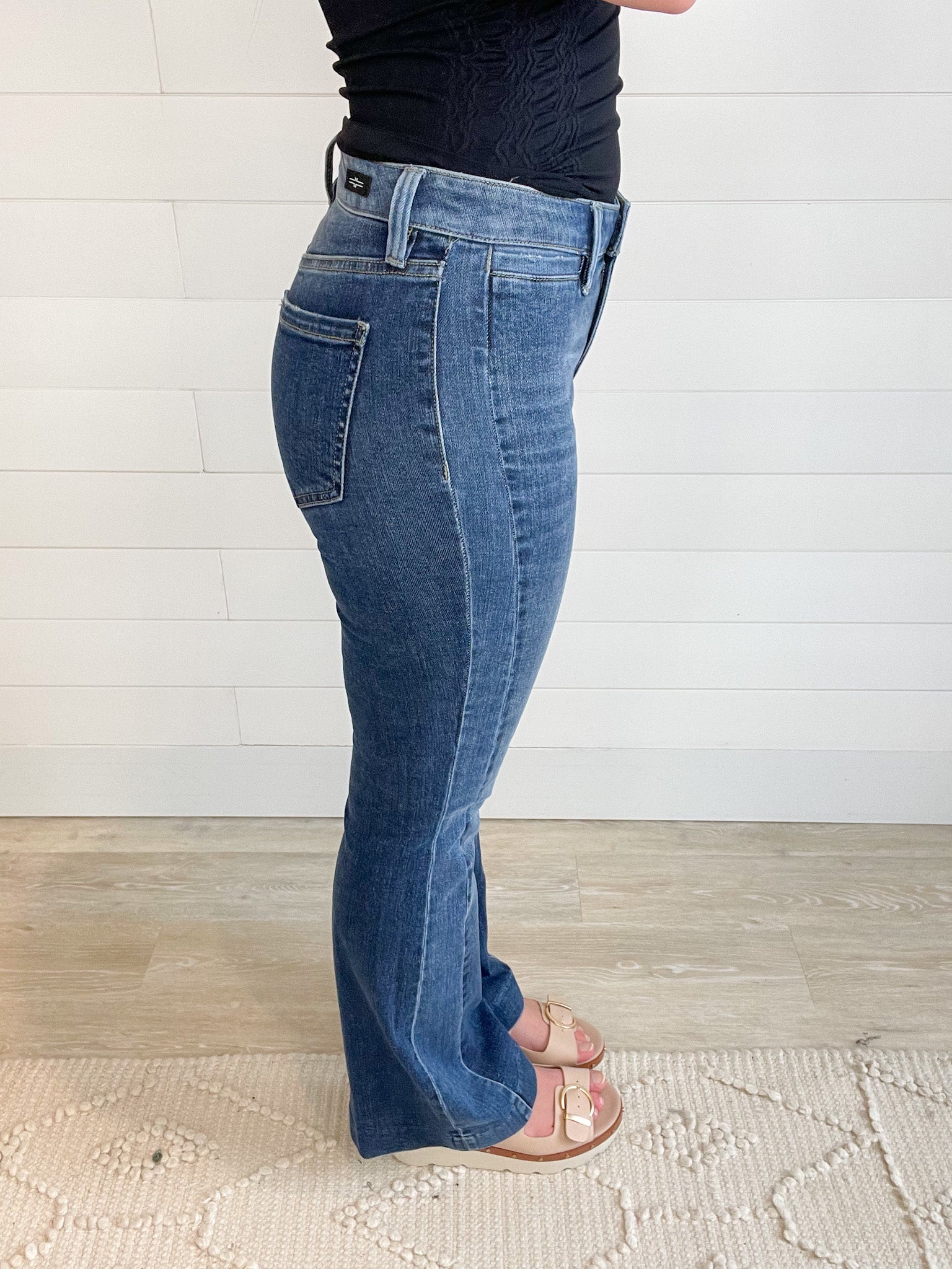The Liverpool Contrast Panel Hannah Flare Jeans put a playful spin on a timeless silhouette. With a flattering 10" rise and a full-length 31" inseam, these cotton-rich flares elongate your legs and elevate your denim game. A lighter denim panel runs down the outside of each leg, adding contrast and a cool, elongating effect. Just the right amount of stretch makes them as comfy as they are eye-catching.