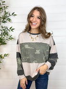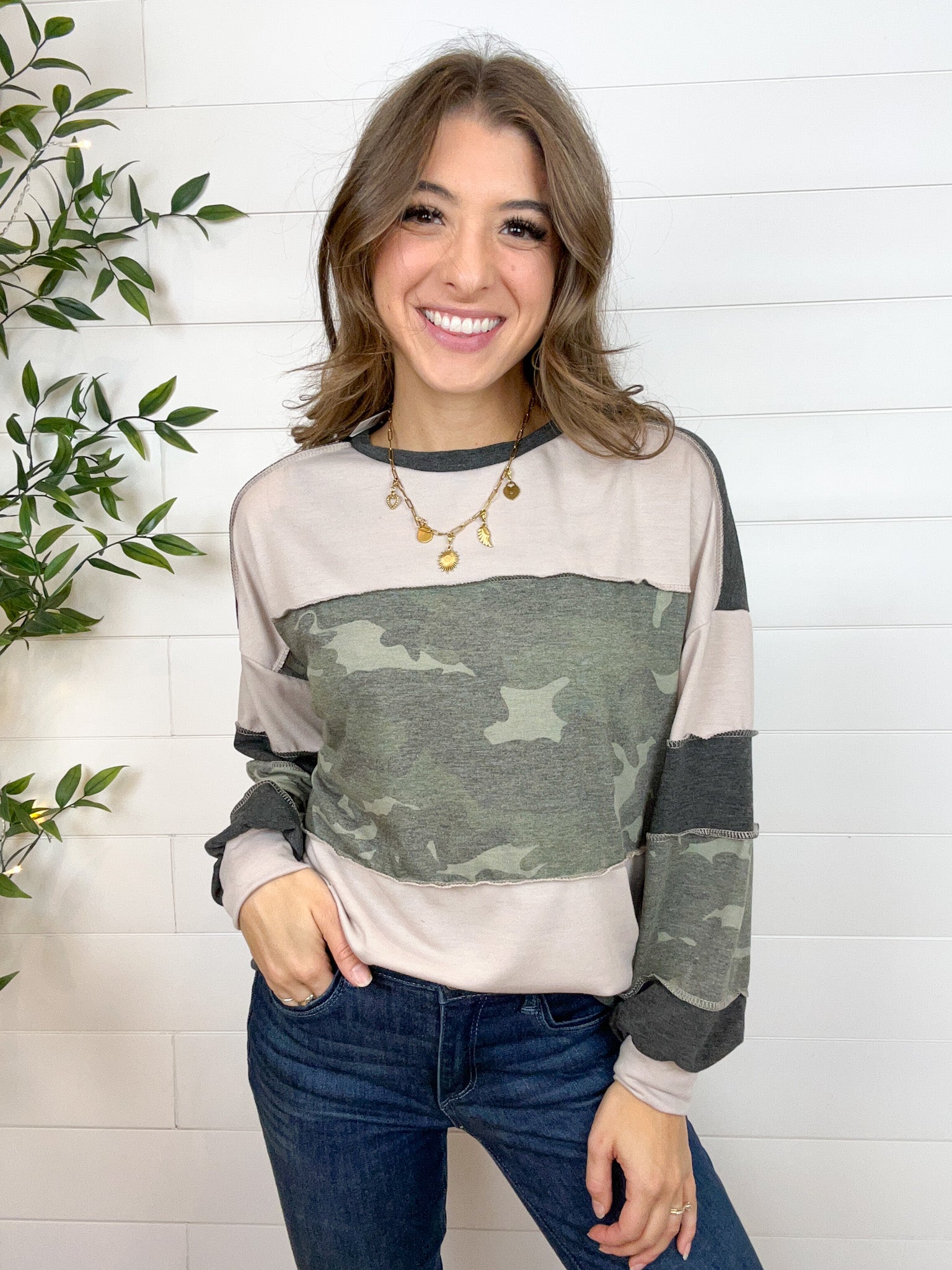 Keep it cozy and cool with the Exposed Seam Camo Striped Oversize Top — a laid-back favorite with just the right amount of edge. Made from soft French terry knit, it features a bold horizontal camo stripe across the front and touches of camo on the sleeves for a fun, sporty twist. The exposed seams, round neckline, and loose, bubble-sleeve fit add that effortlessly undone vibe we love. Comfy, relaxed, and ready for anything — it’s the ultimate off-duty top with a playful punch.