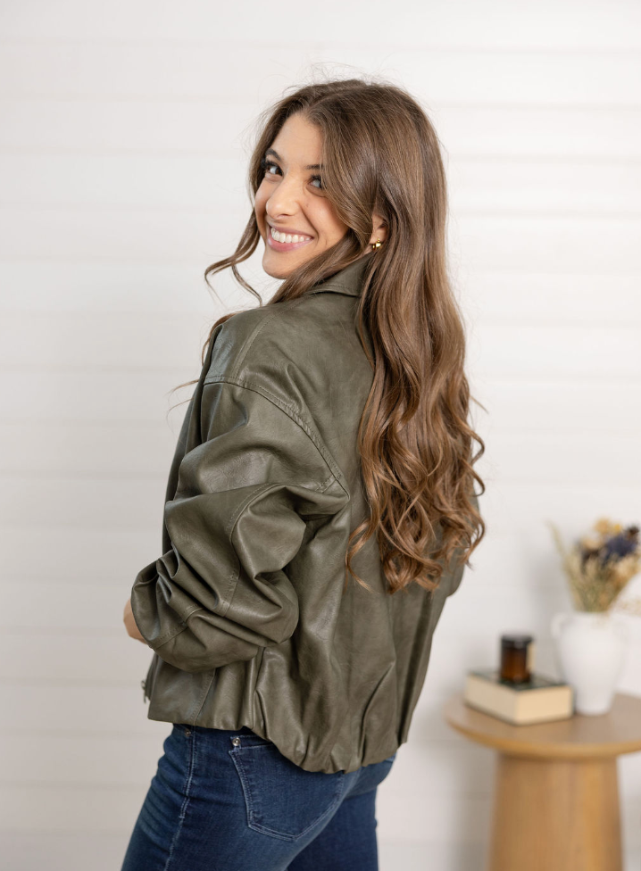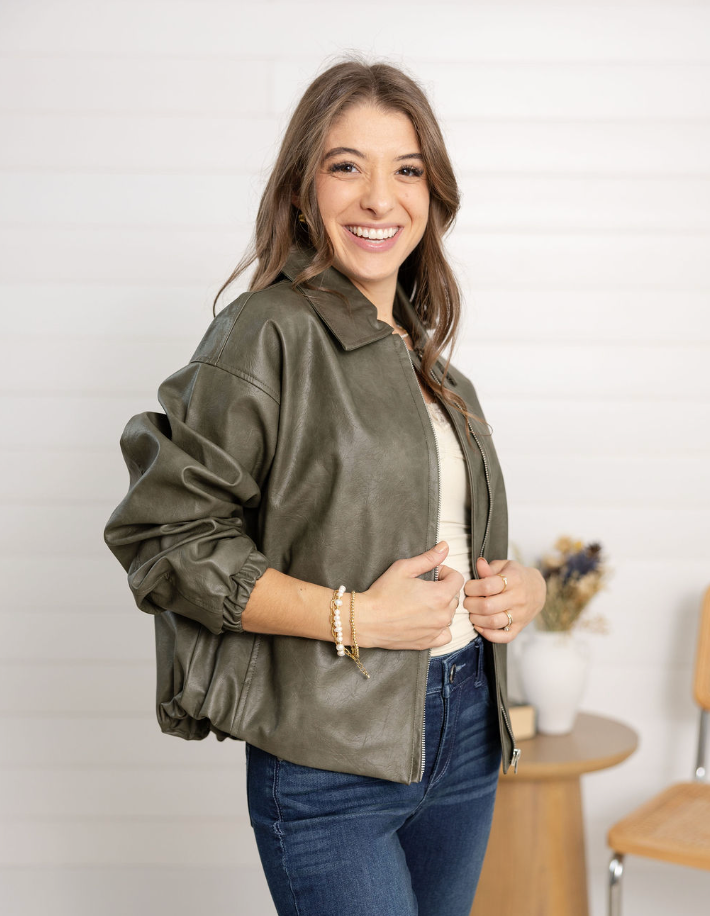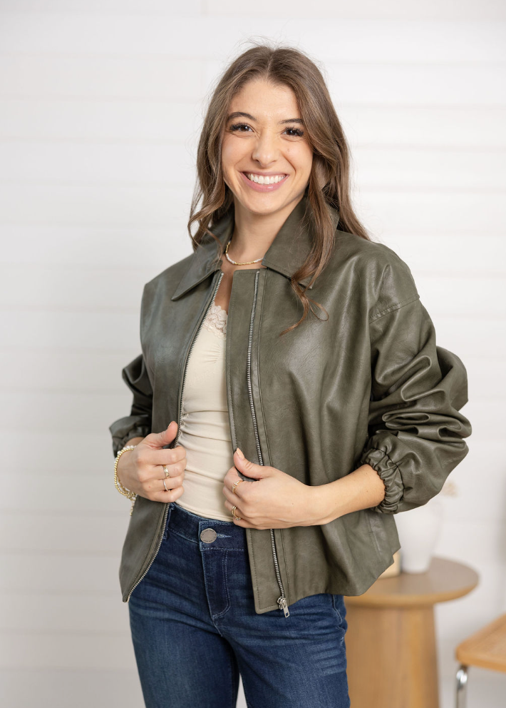 The Faux Leather Classic Bomber Jacket is a wardrobe must-have with modern detailing. Crafted in coated polyester for a sleek, luxe finish, it features ruched sleeves, a bubble hem, and a classic collar. Front pockets add practicality, while the tailored silhouette makes it perfect for layering over everything from tees to dresses.