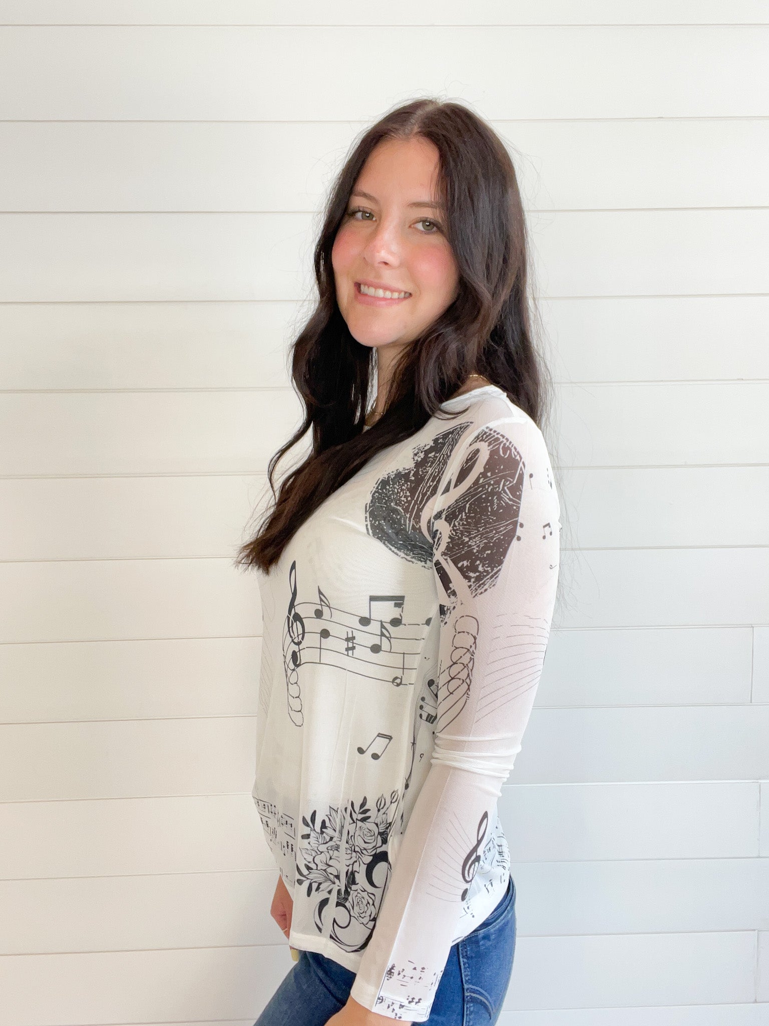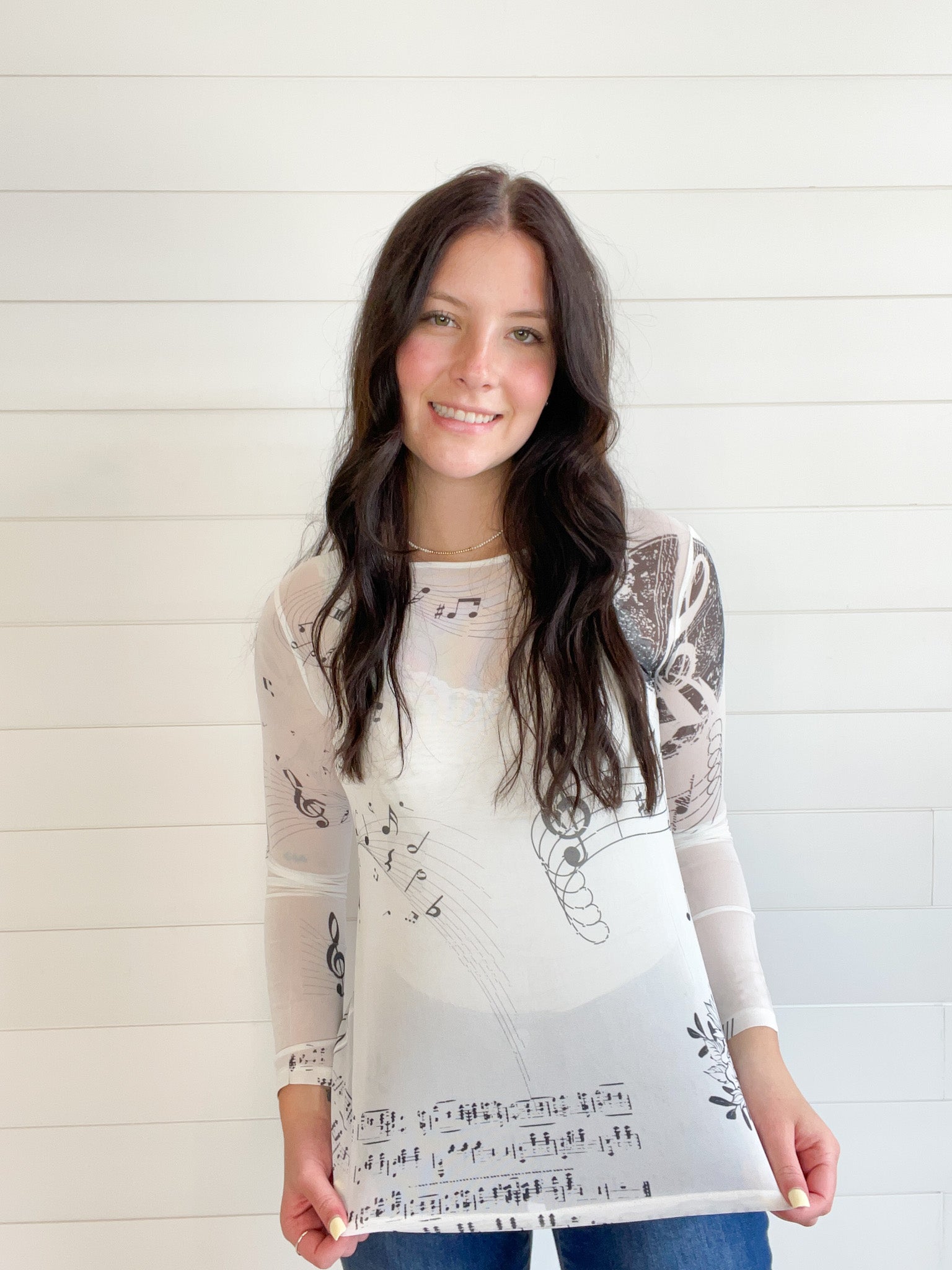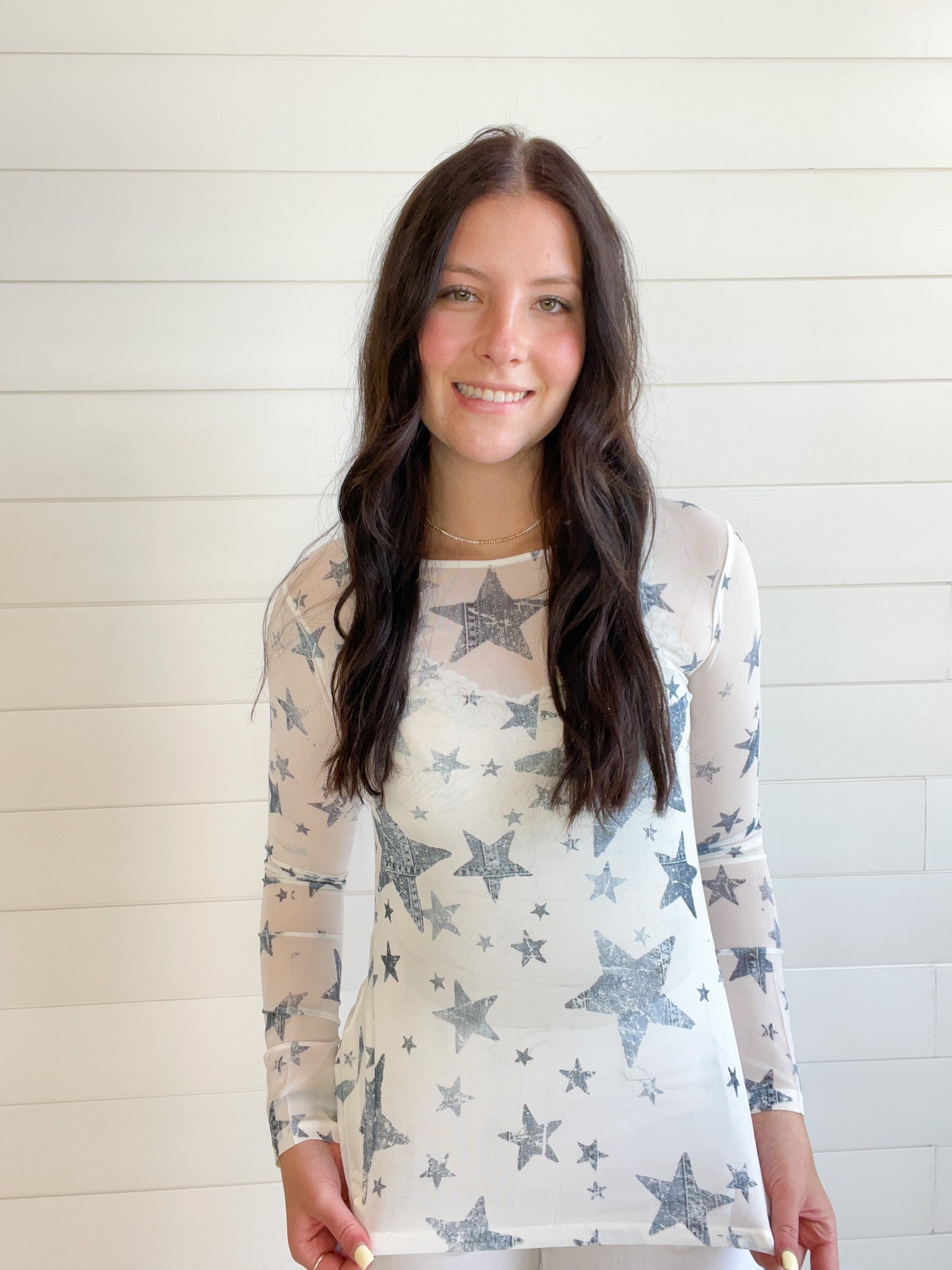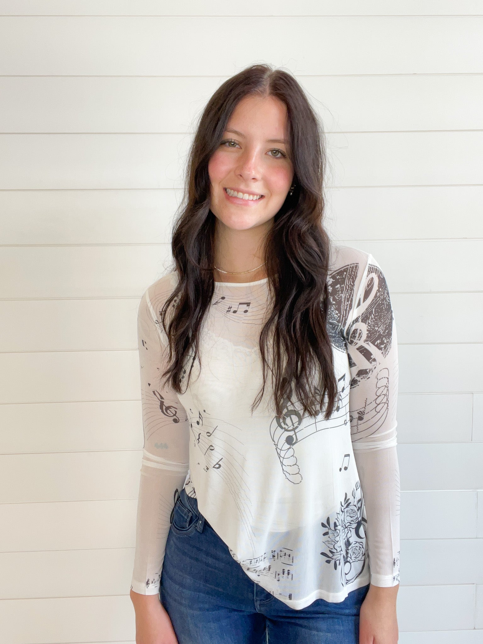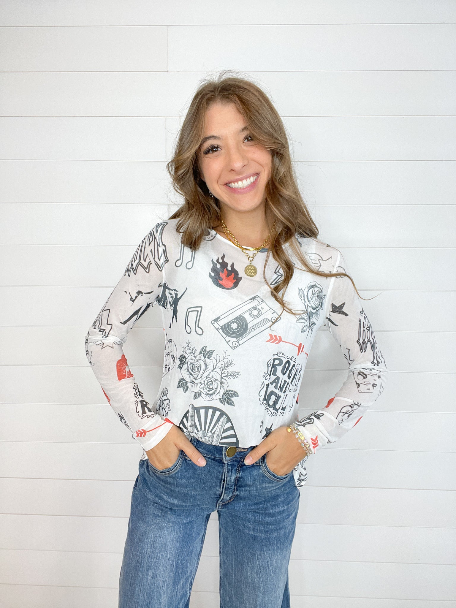 The Graphic Print Lightweight Stretchy Mesh Layering Top adds a playful touch to your casual wardrobe.