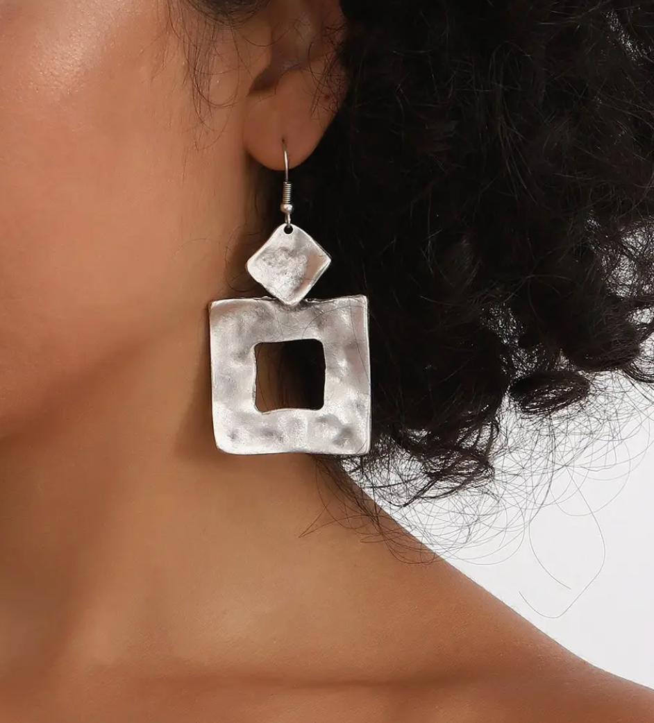 These hammered silver earrings play with proportion and shape in the most striking way. A diamond-angled stud anchors a larger open square that sways gently below, catching the light with every move. The textured metal finish adds depth and shine, while the geometric silhouette keeps things fresh and modern.