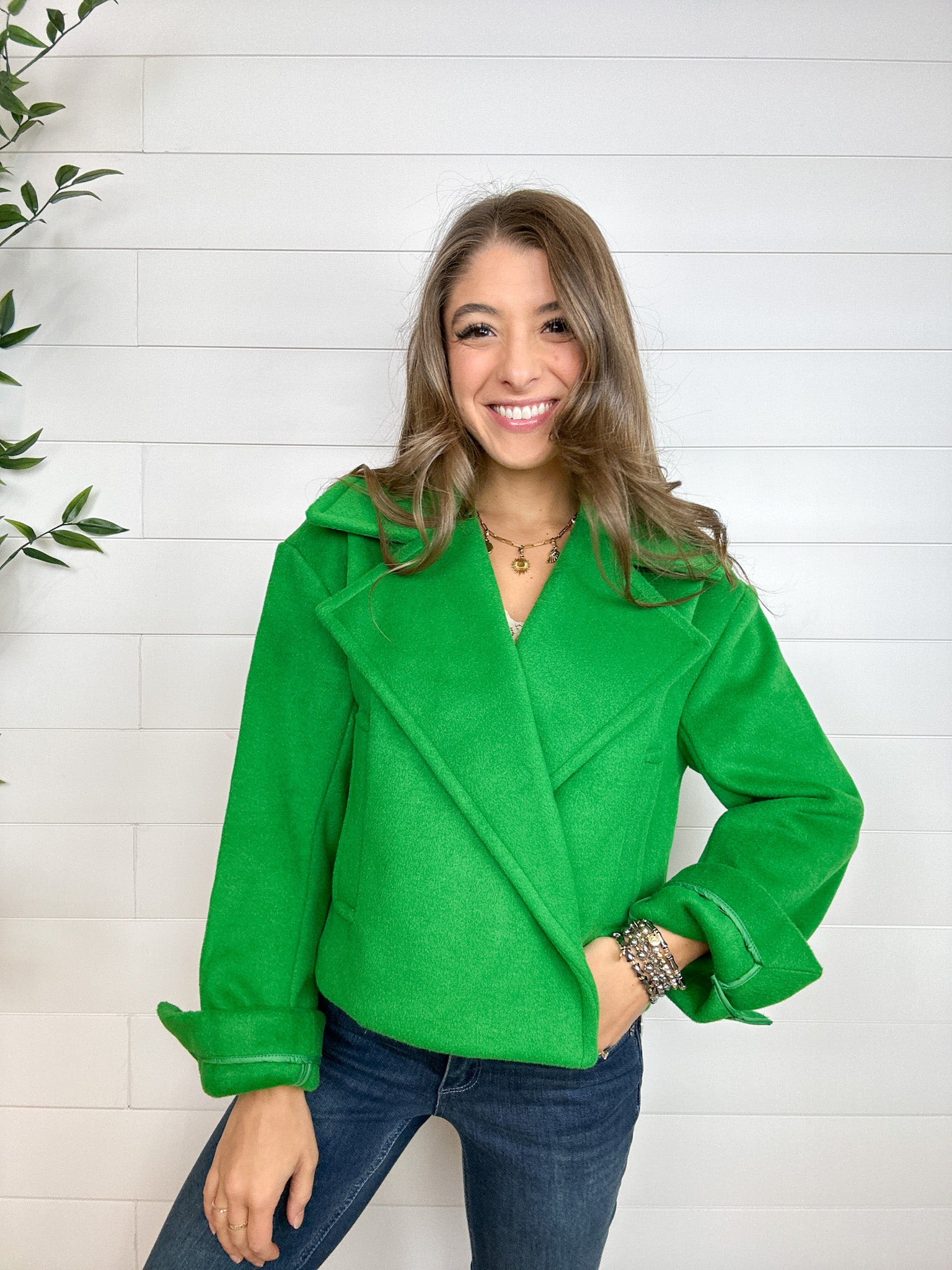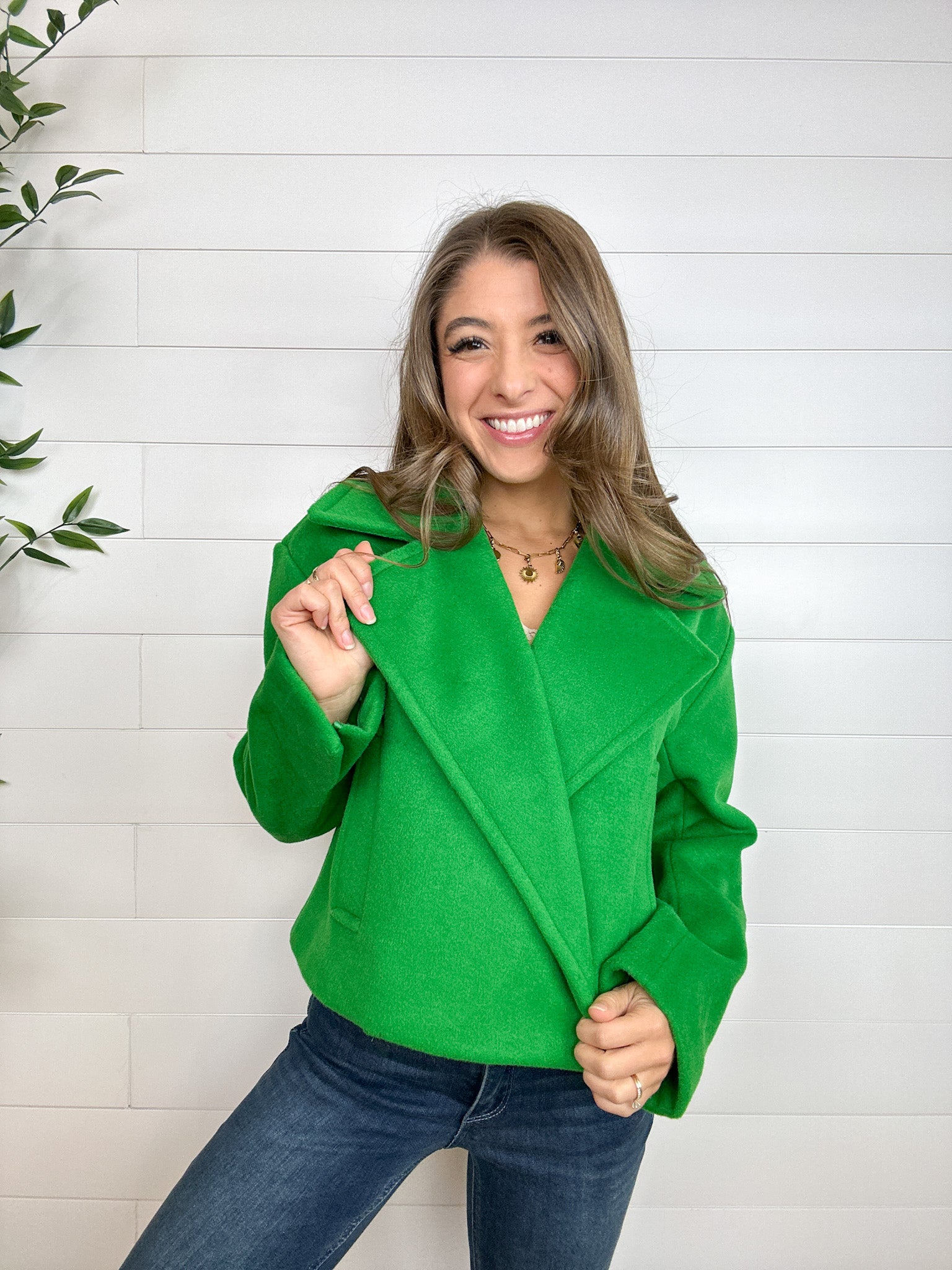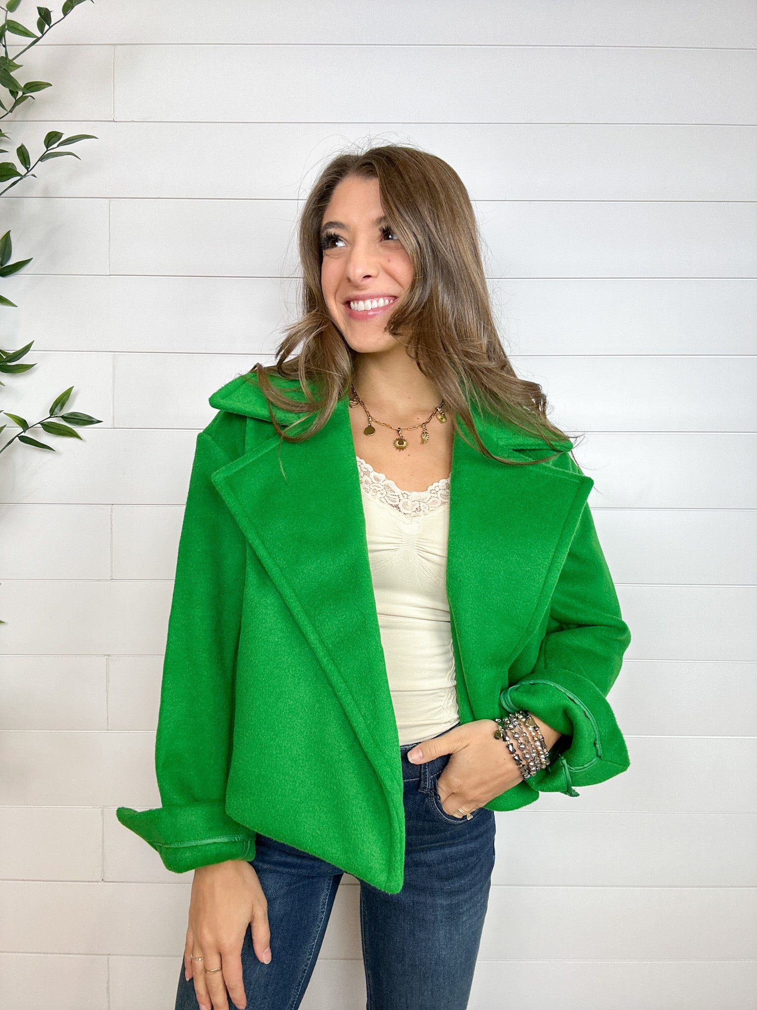 Meet the Harper Notch Collar Cropped Jacket — your new pop-of-color power piece! In a bold, vibrant kelly green that instantly brightens your day, this jacket brings structure and sass in all the right ways. The notch collar and split cuffs add a polished touch, while the cropped length makes it oh-so-perfect for pairing with high-waisted jeans or skirts.
