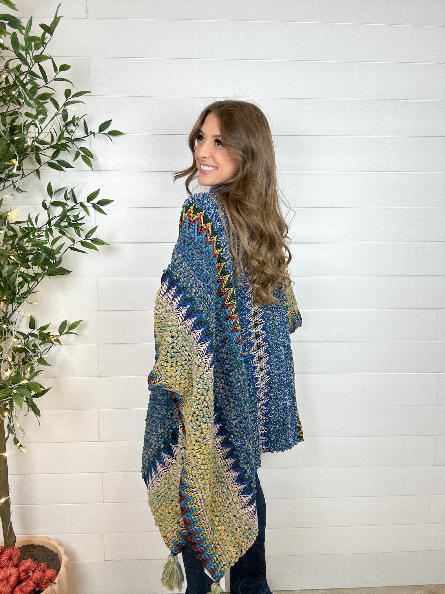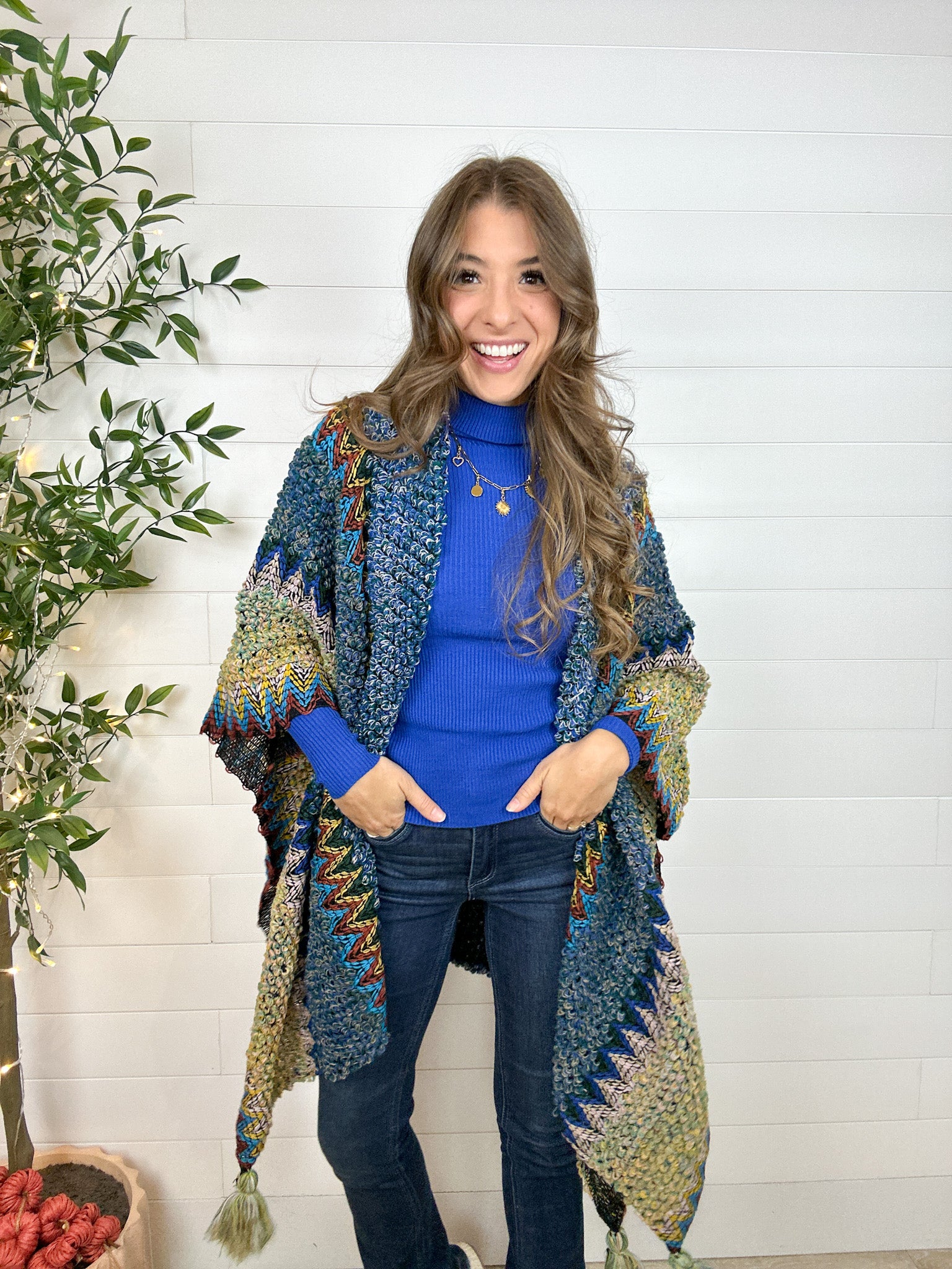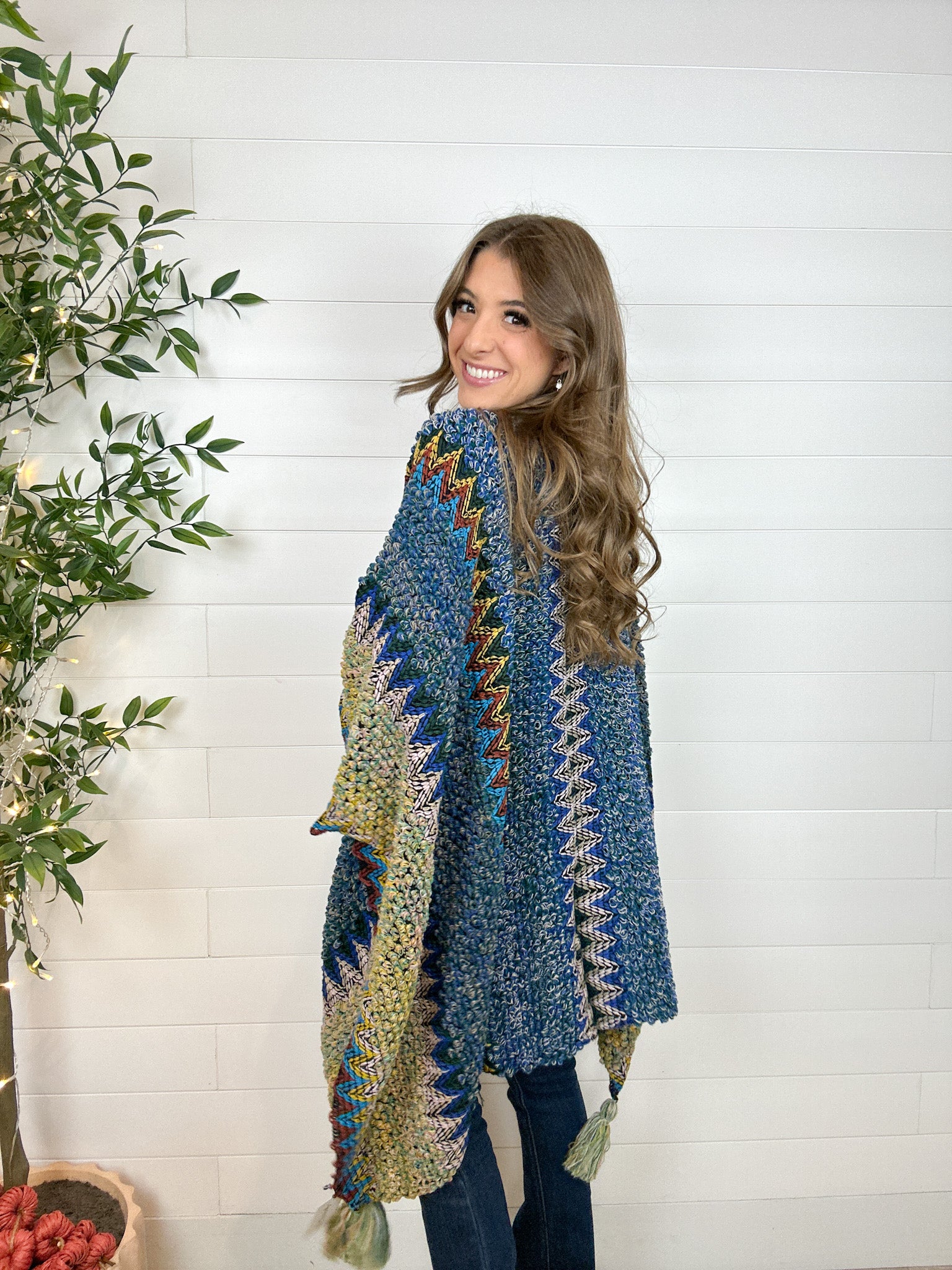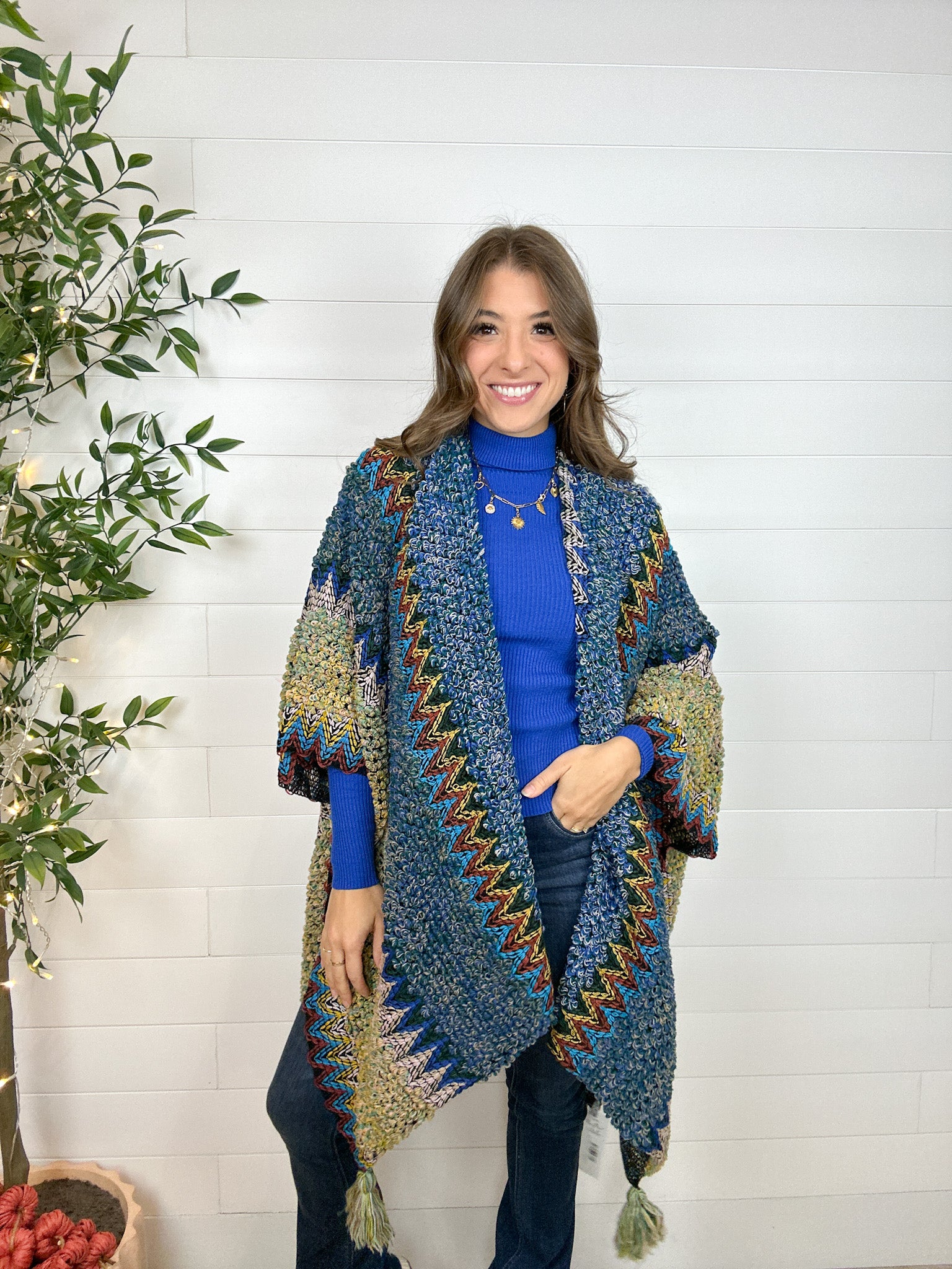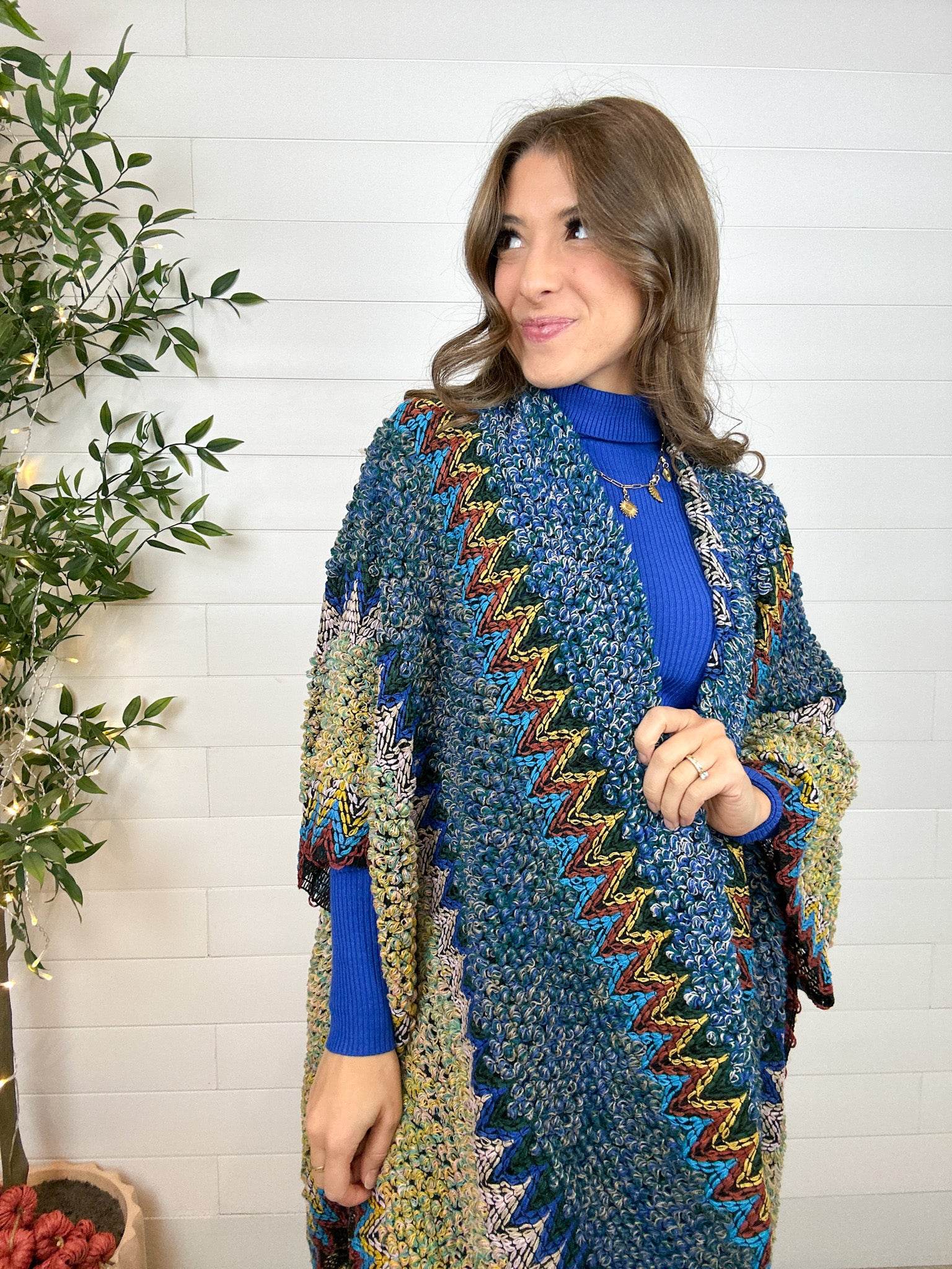 Turn every outfit into a statement with the Intricate Mixed Knit Structured Ruana — a colorful, crochet-inspired piece that radiates effortless charm. With its vibrant mix of hues and artful knit pattern, it’s equal parts cozy and eye-catching. The structured design sits perfectly on your shoulders, while hidden armholes keep it comfortably in place as you move. Lightweight yet warm, it’s the perfect layer for those in-between days when you want to add a little boho flair (and a lot of color) to your look.