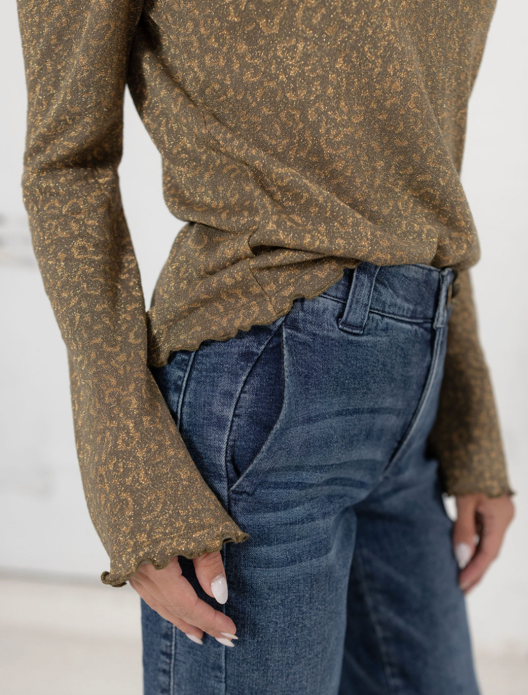Featuring long bell sleeves, a mock neck, lettuce edge detailing, and a metallic abstract animal print, this knit top brings all the style. Perfect for wearing on its own or as a base layer.