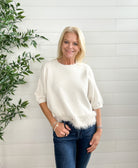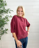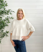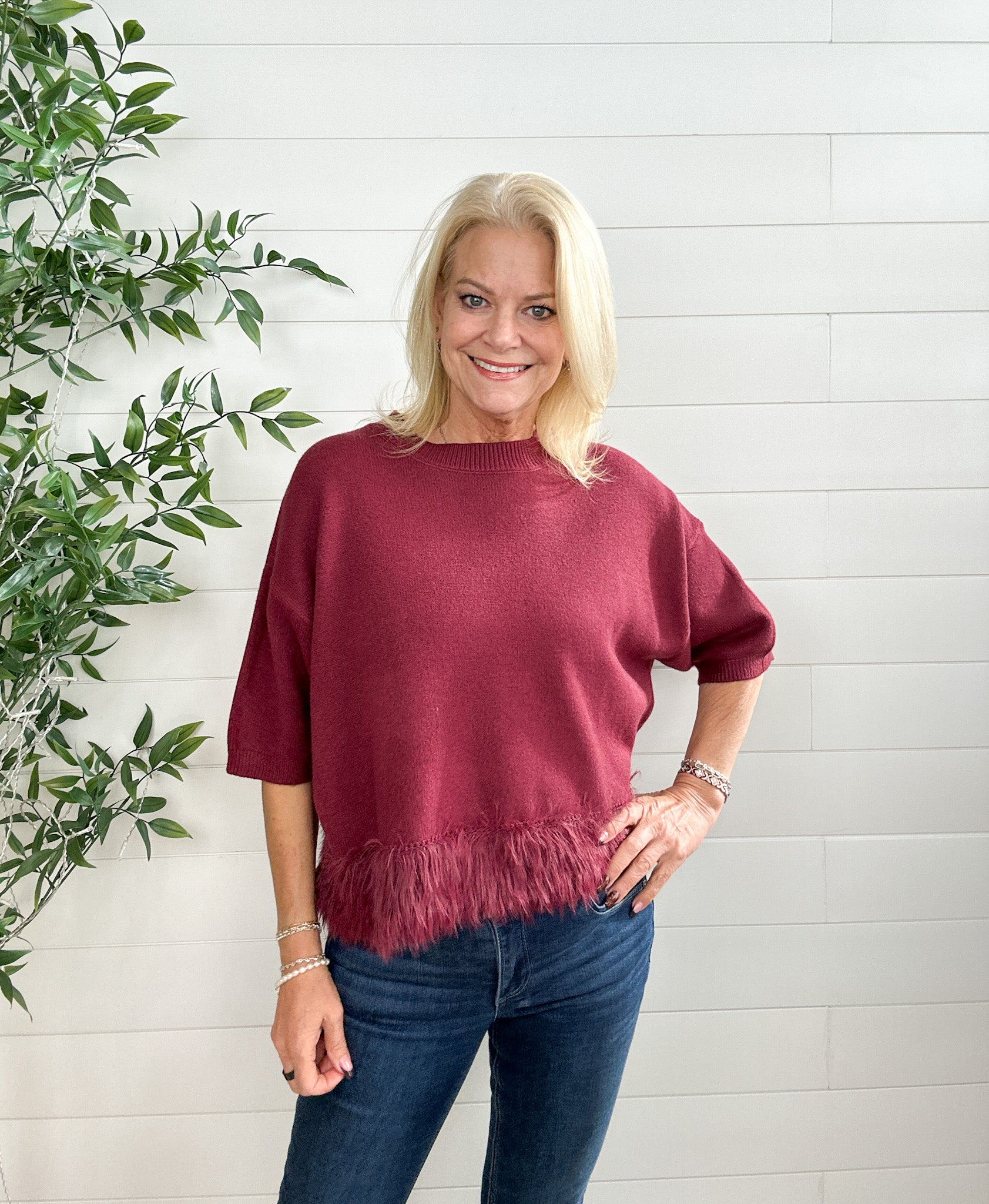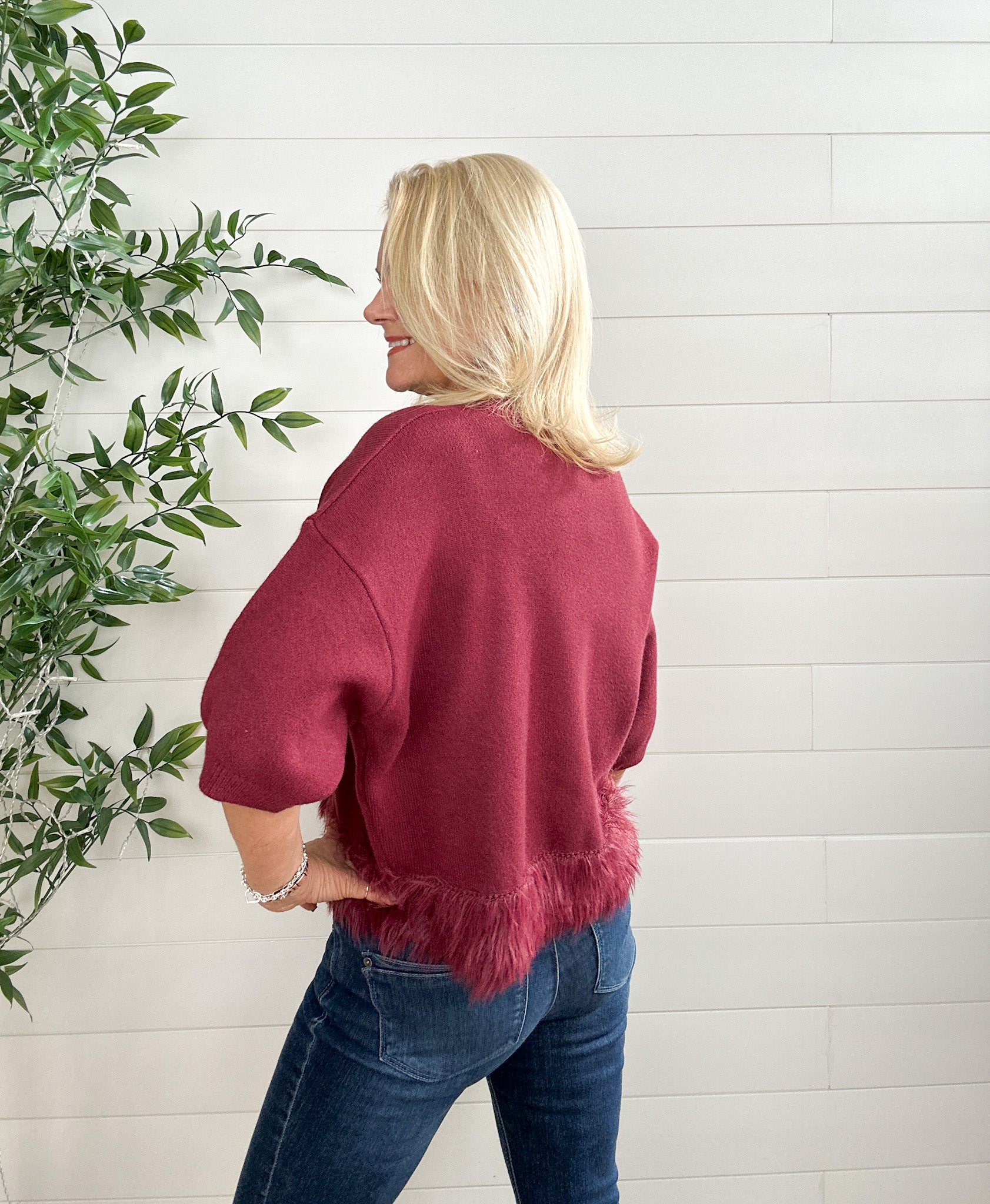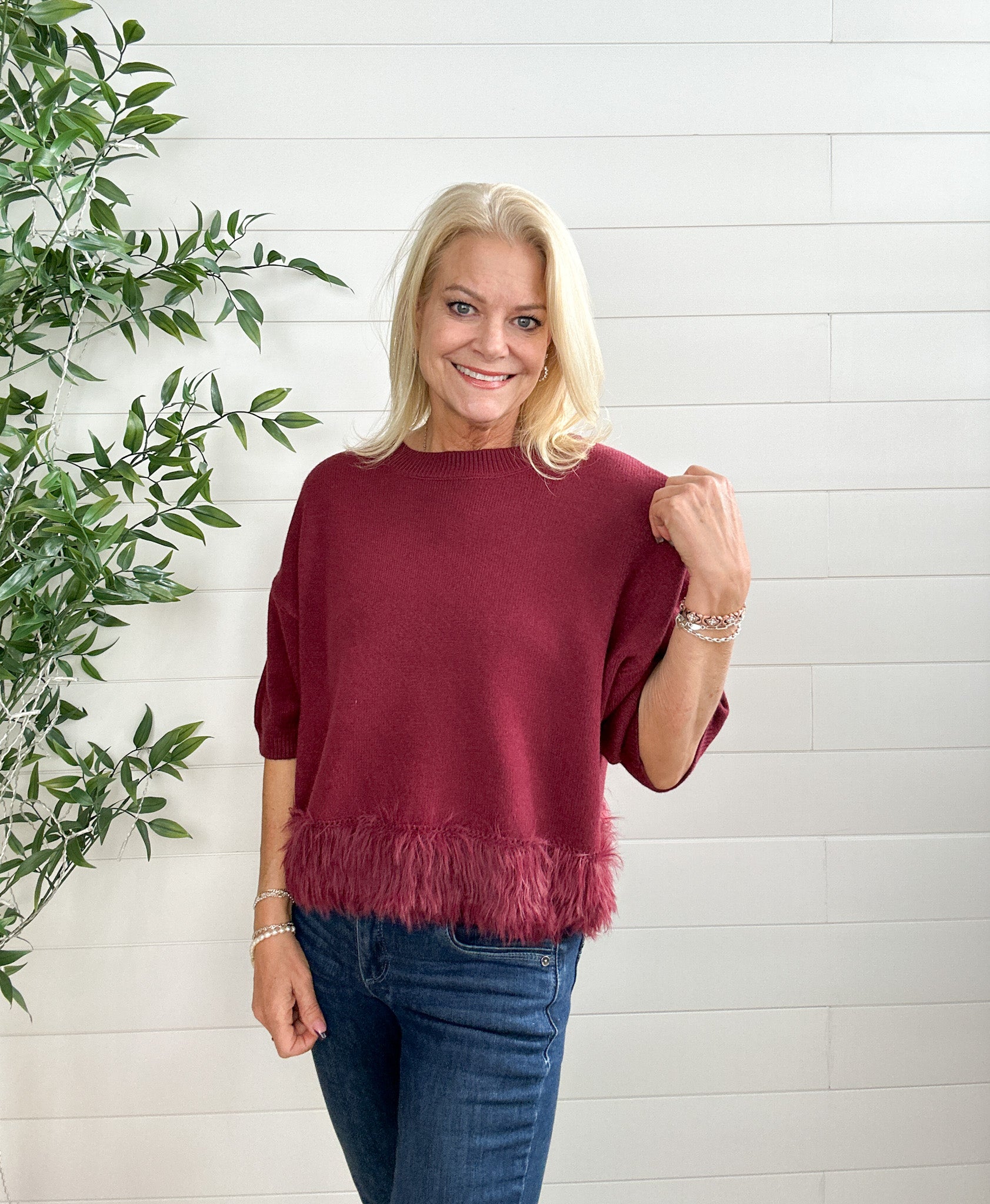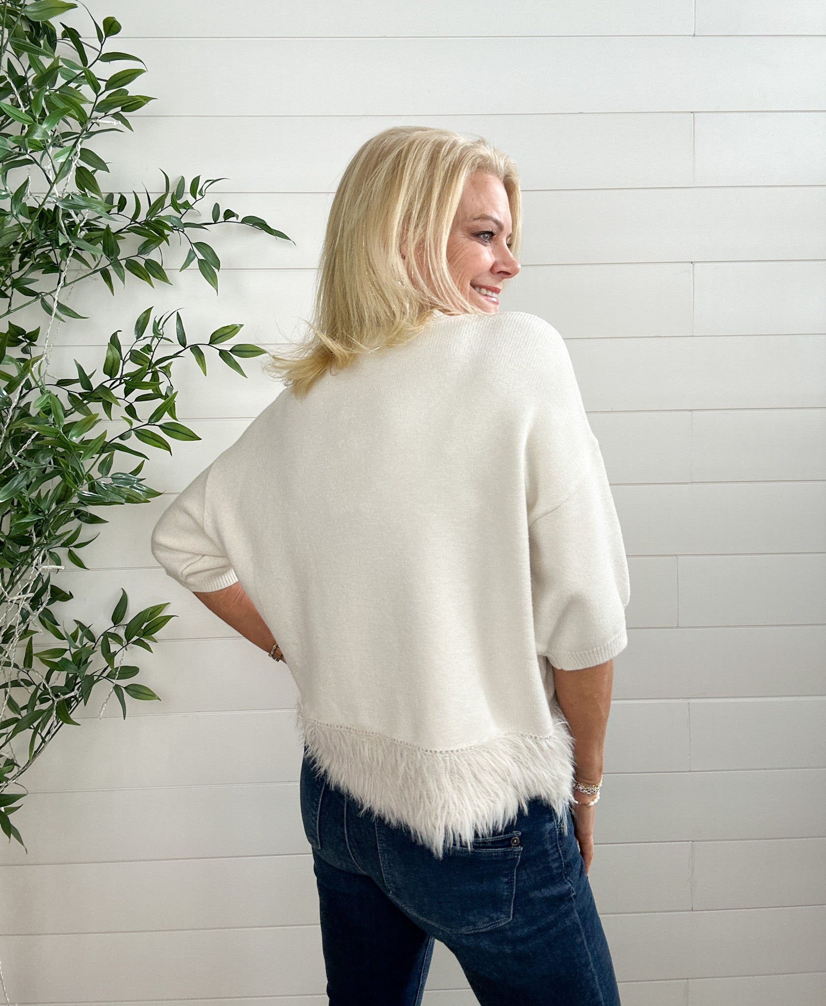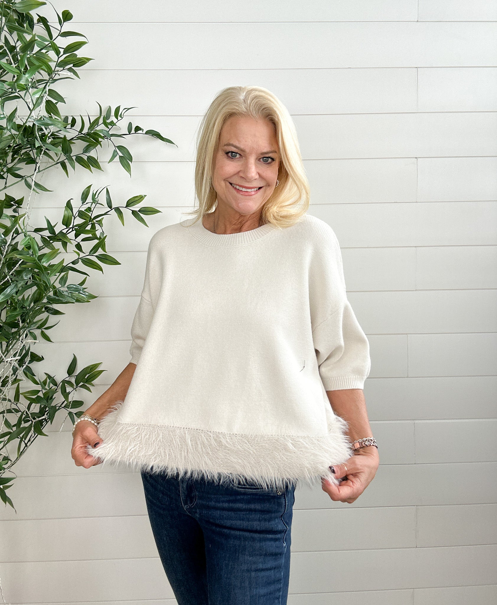 Our Made in Italy Fur Trim Sweater is where cozy meets just a touch of drama. With its chic 3/4 sleeves and a plush ~2" faux fur trim along the hem, this soft knit brings instant elegance to even the simplest outfit.