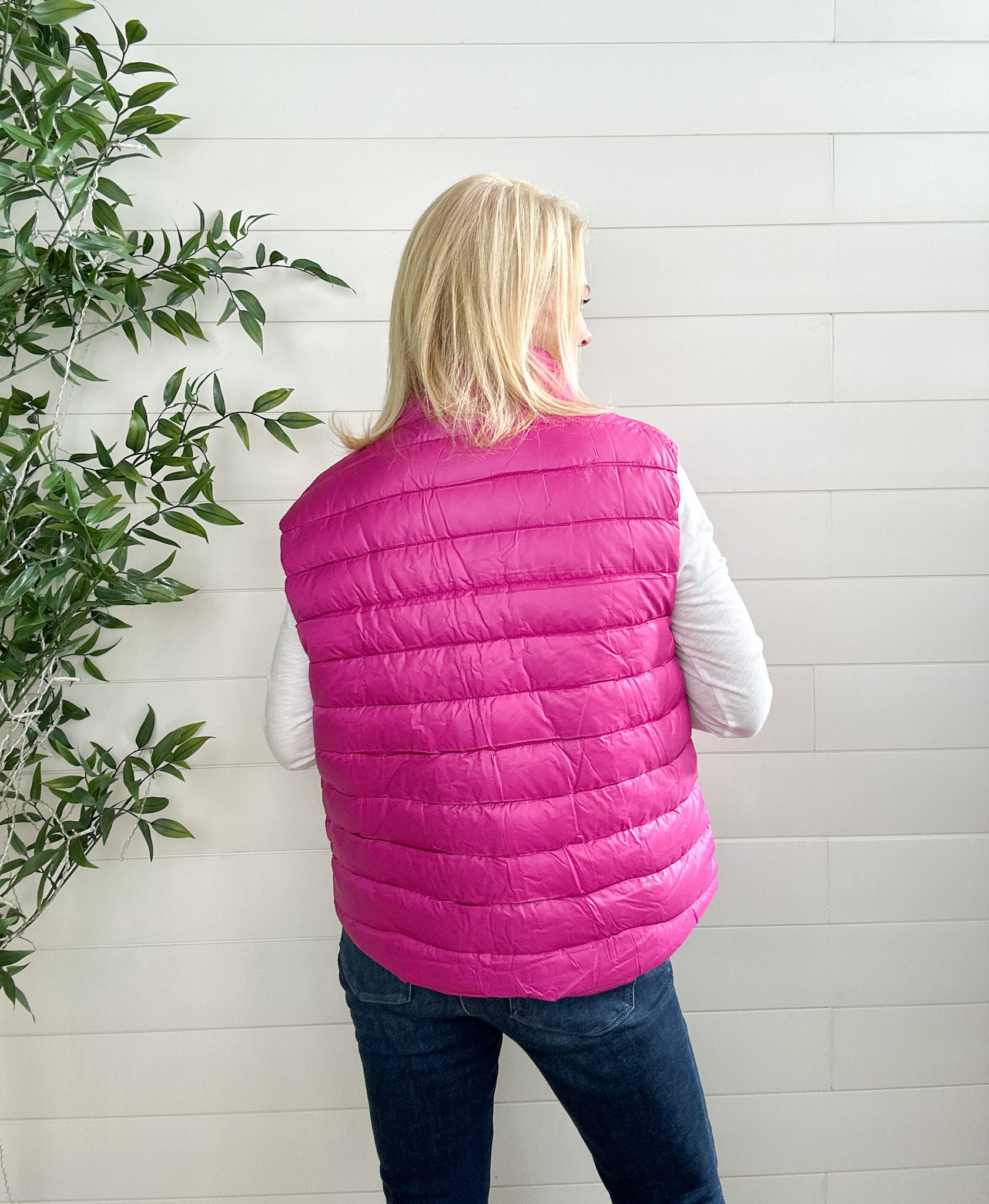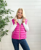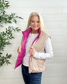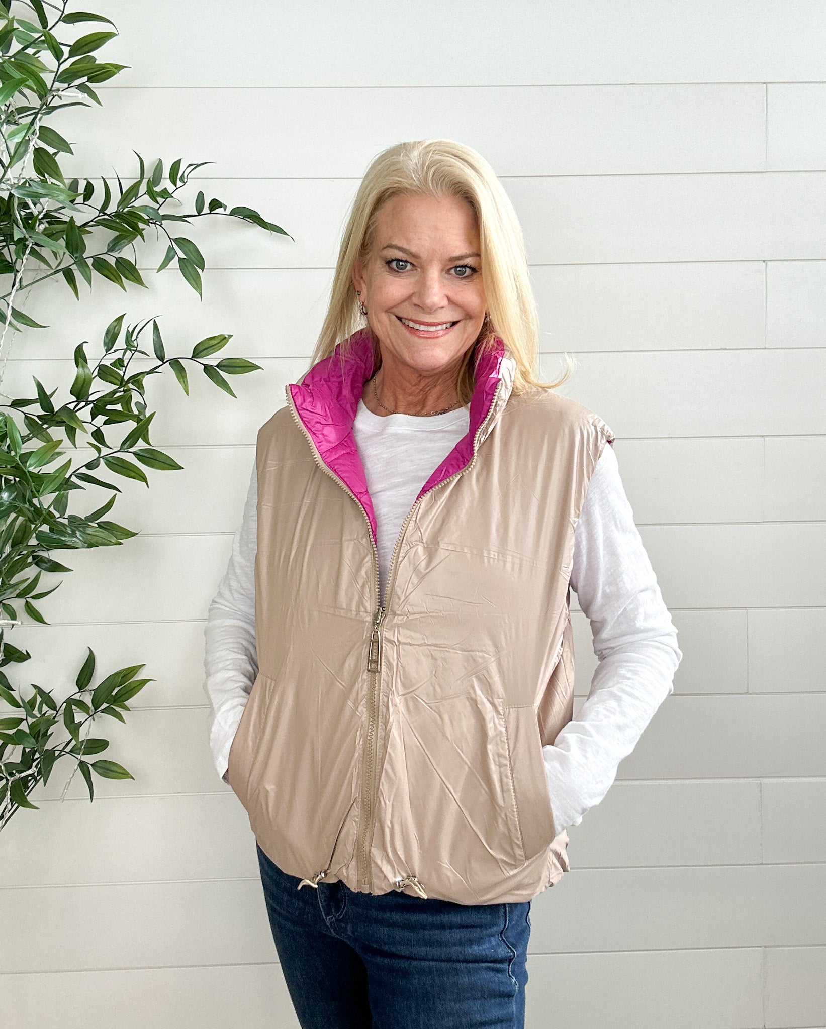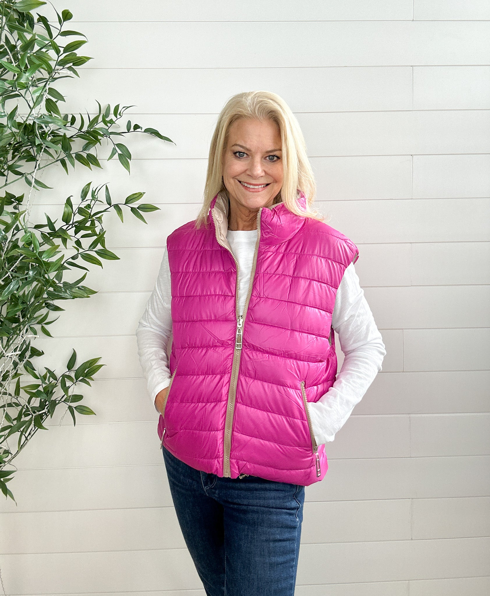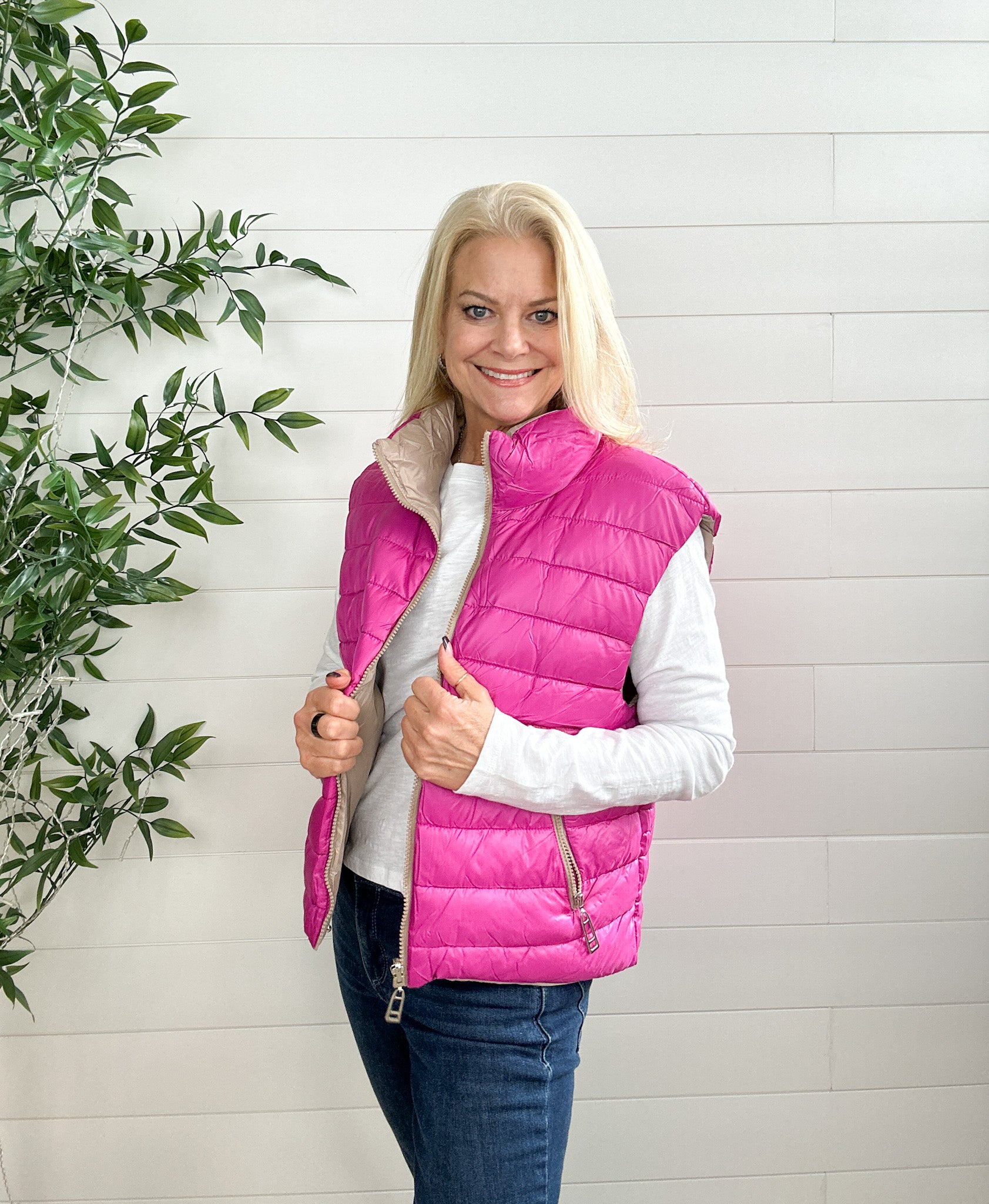 Meet your new cold-weather sidekick β€” the Made in Italy Reversible Cozy Puffer Vest! One side brings the bold pop of telemagenta, the other keeps it classic with a chic taupe, giving you two totally different vibes in one ultra-comfy piece. Light, plush, and outdoor-adventure ready, this vest zips up easily and layers like a dream.