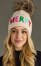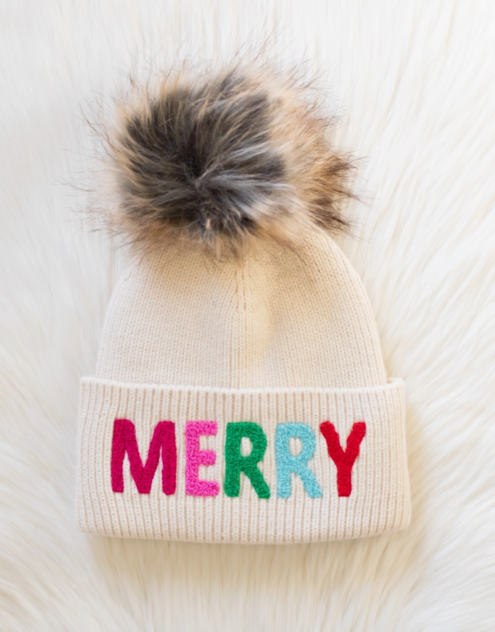 Multicolored textured "MERRY" on cuff Natural faux fur pom Fleece lined 100% Acrylic