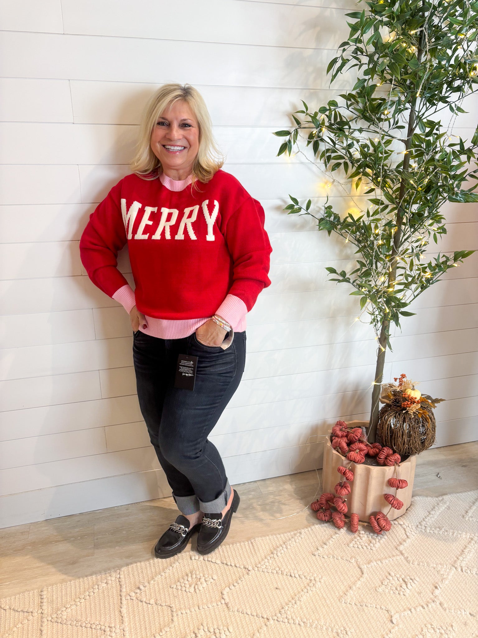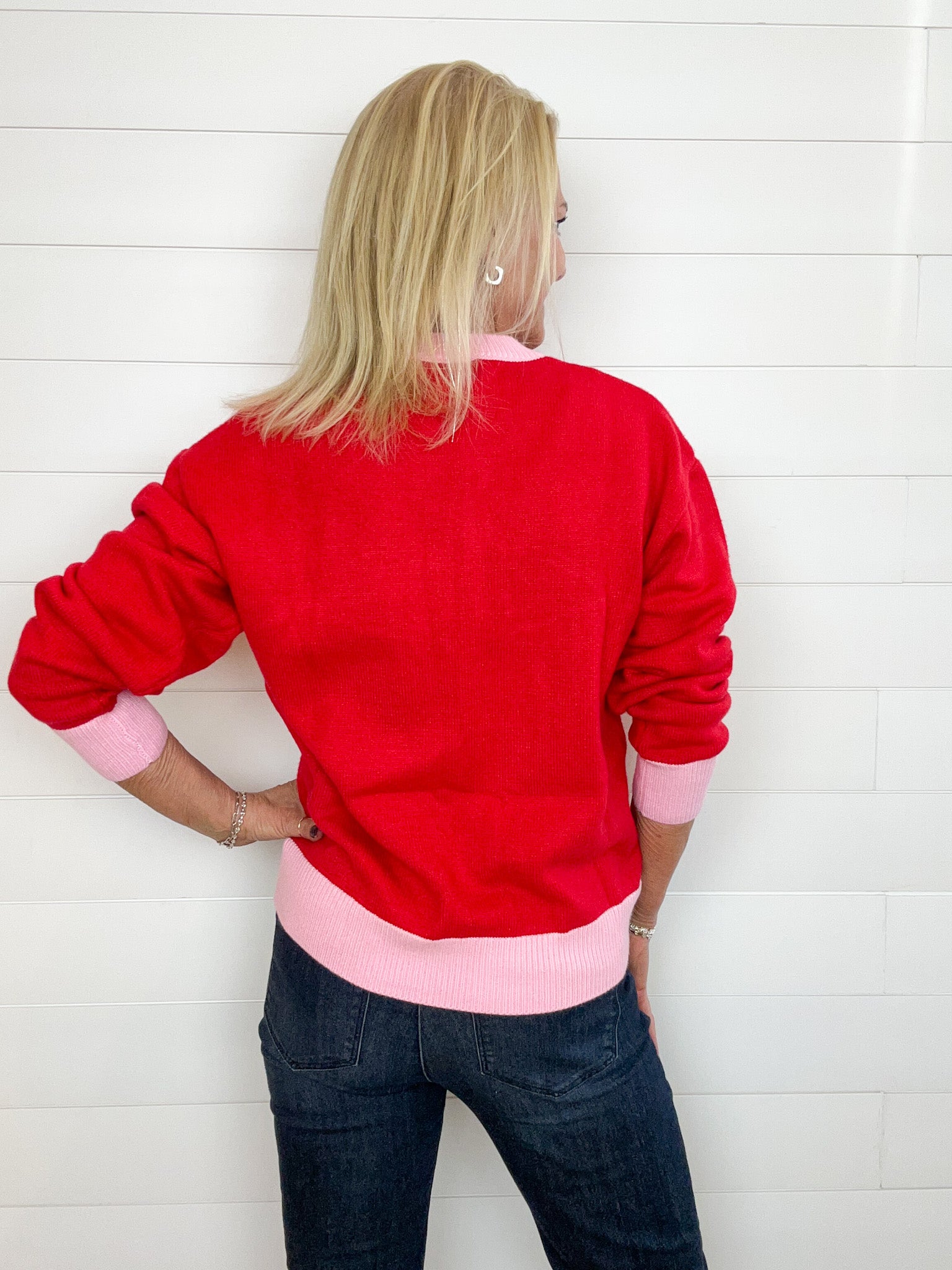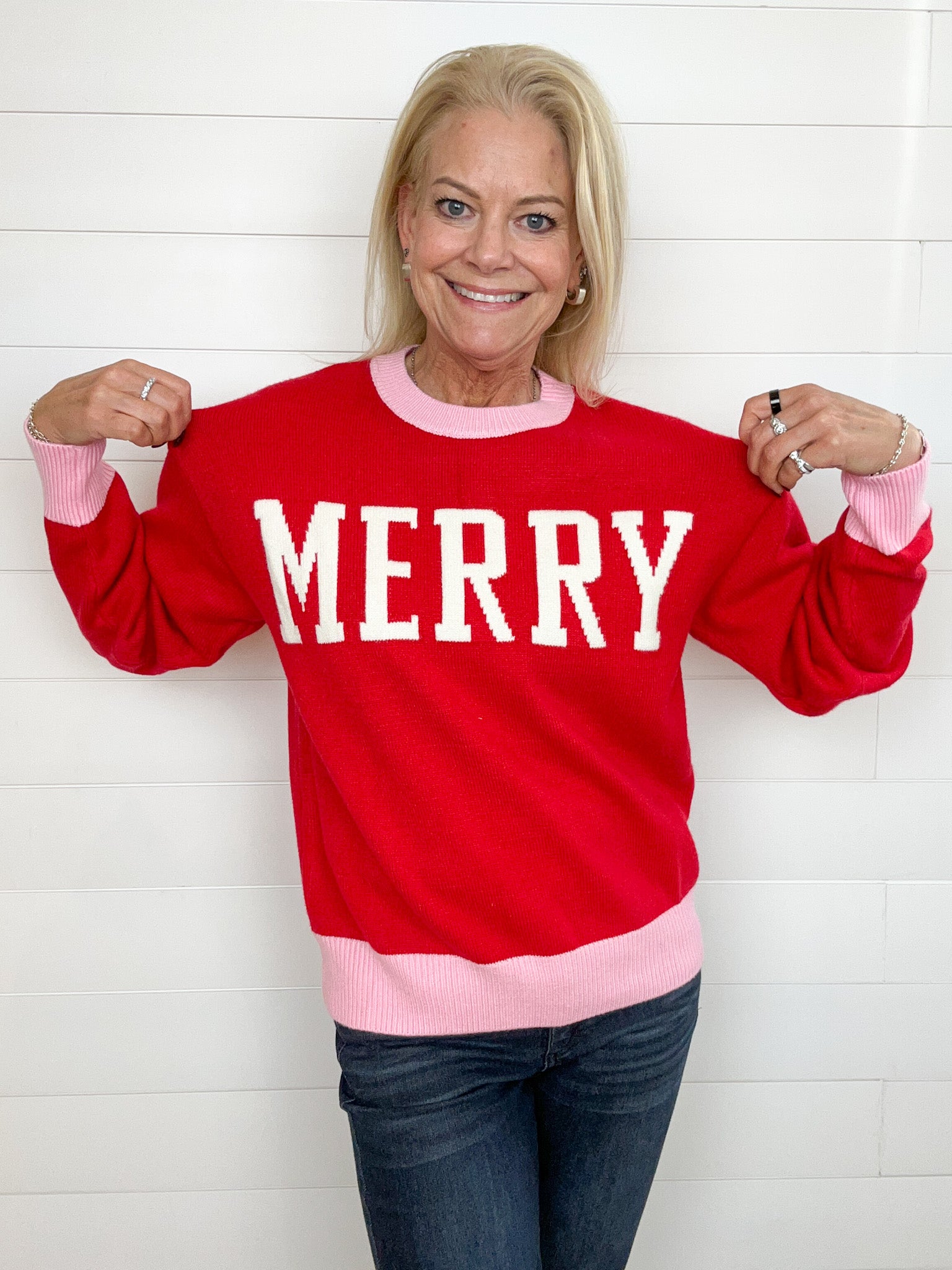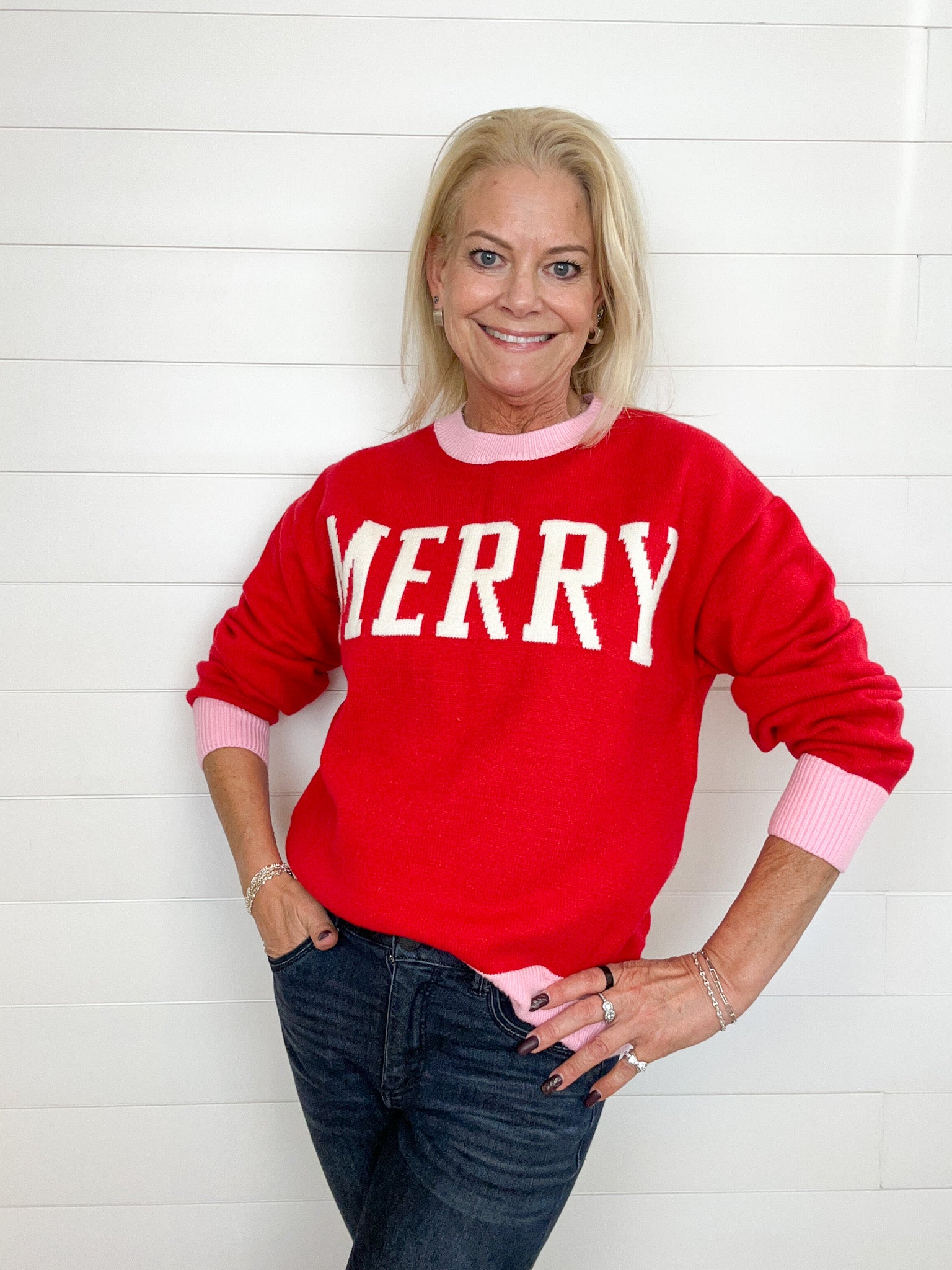 Our “Merry” Varsity Letter Contrast Hem Sweater is the cutest way to wear your holiday spirit loud and proud! With a cozy red body, playful pink contrast hems, and cream varsity lettering spelling out “Merry,” it’s the definition of cheerful-chic. The slightly oversized fit keeps it comfy for cocoa sipping, gift wrapping, or just spreading joy all season long.