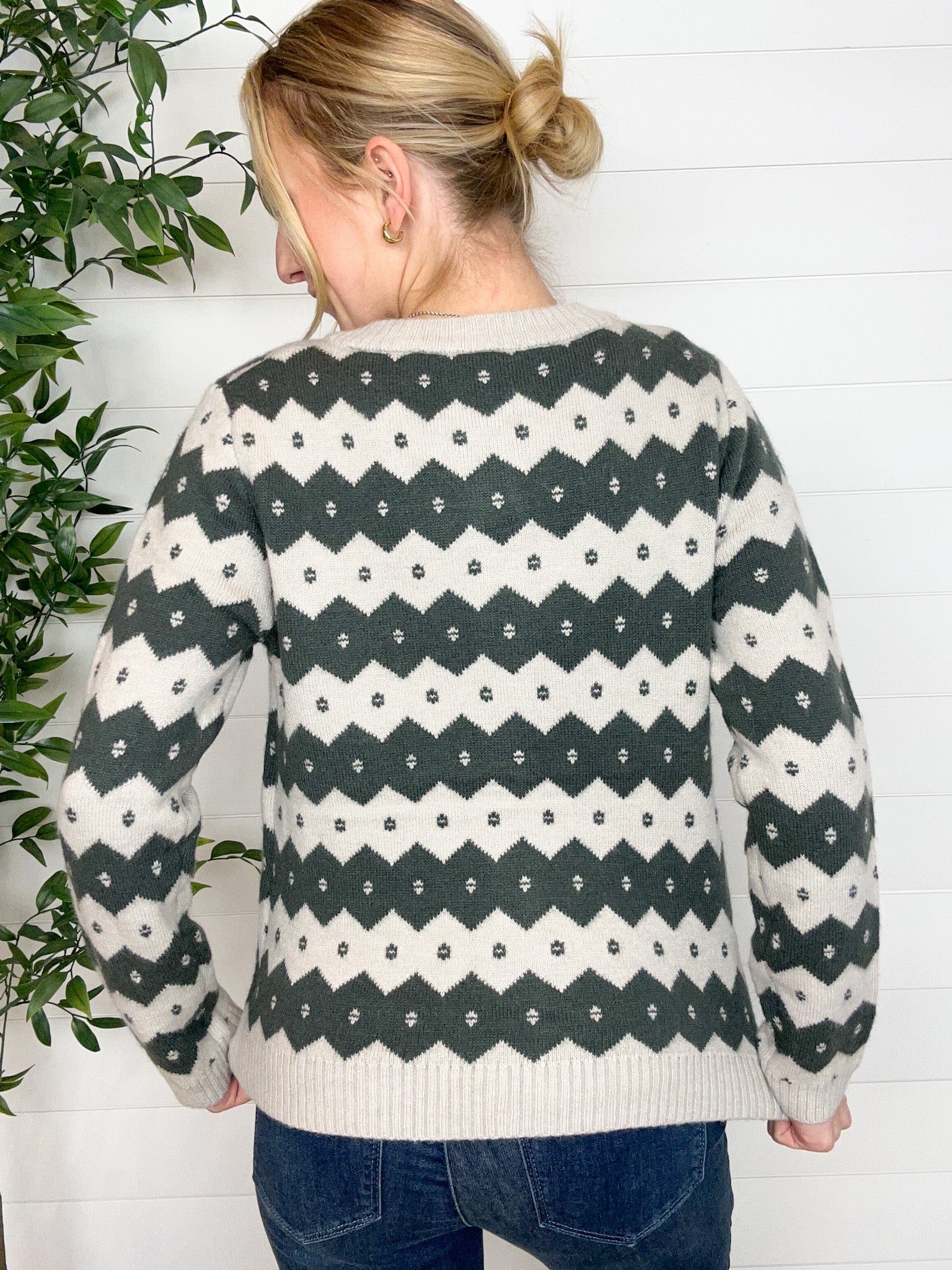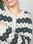 Wrap yourself in winter charm with the Nordic Diamond Stripe Cardigan — a cozy knit that feels like a warm hug on a chilly day. With rows of diamonds and tiny dotted centers across the body, this sweater has that classic, ski-lodge-meets-street-style vibe. The slightly thicker knit adds a luxe, comfy feel, while the button-up front and crew neckline keep it timeless and easy to layer.