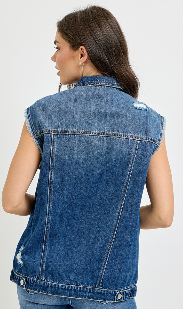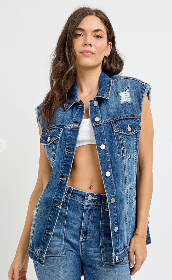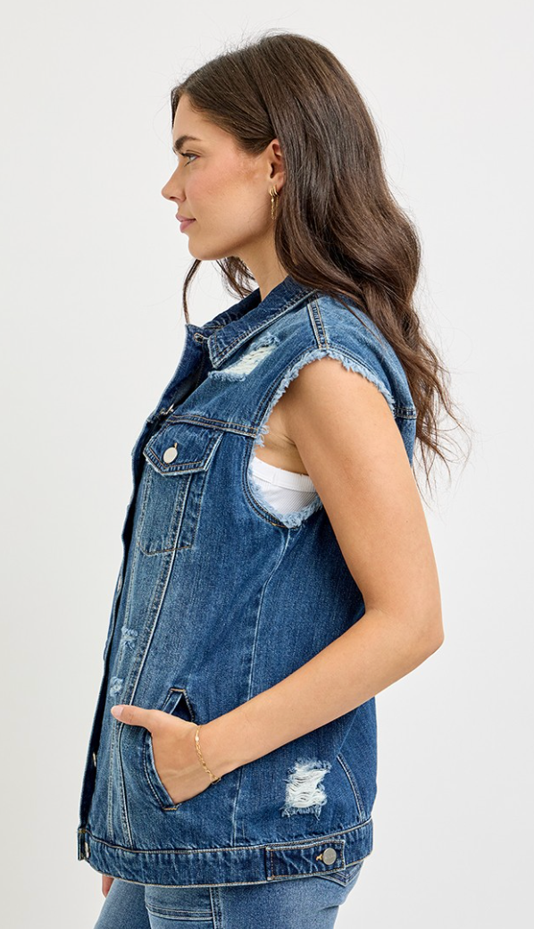 Add effortless edge to any outfit with the Oversized Fray Hem Denim Vest. Featuring subtle distressing on the front and back, a classic collar, and a frayed hem, this cotton vest is perfect for layering over tees, blouses, or lightweight sweaters. Its oversized fit gives a relaxed, modern silhouette.