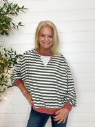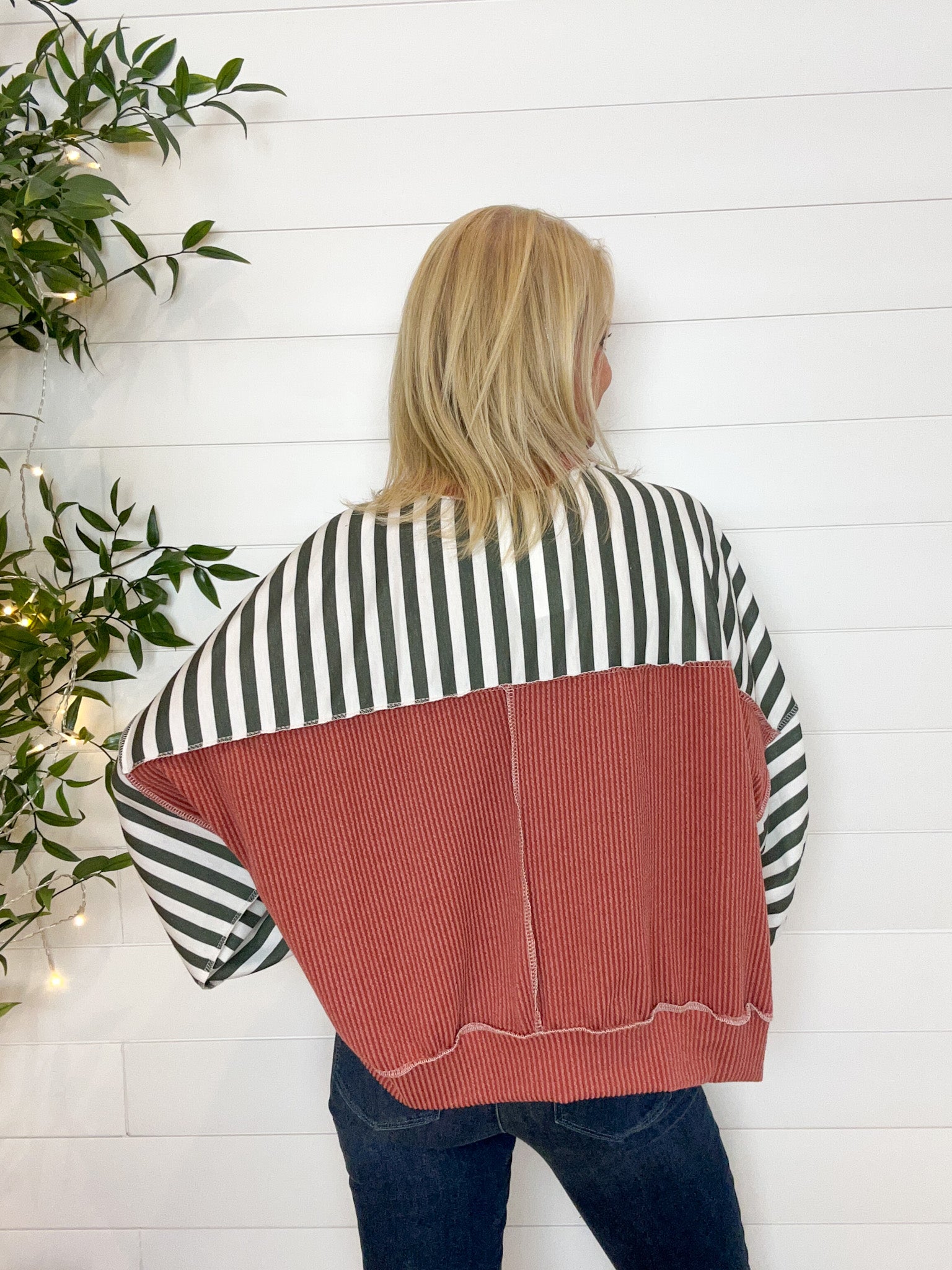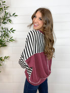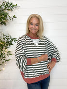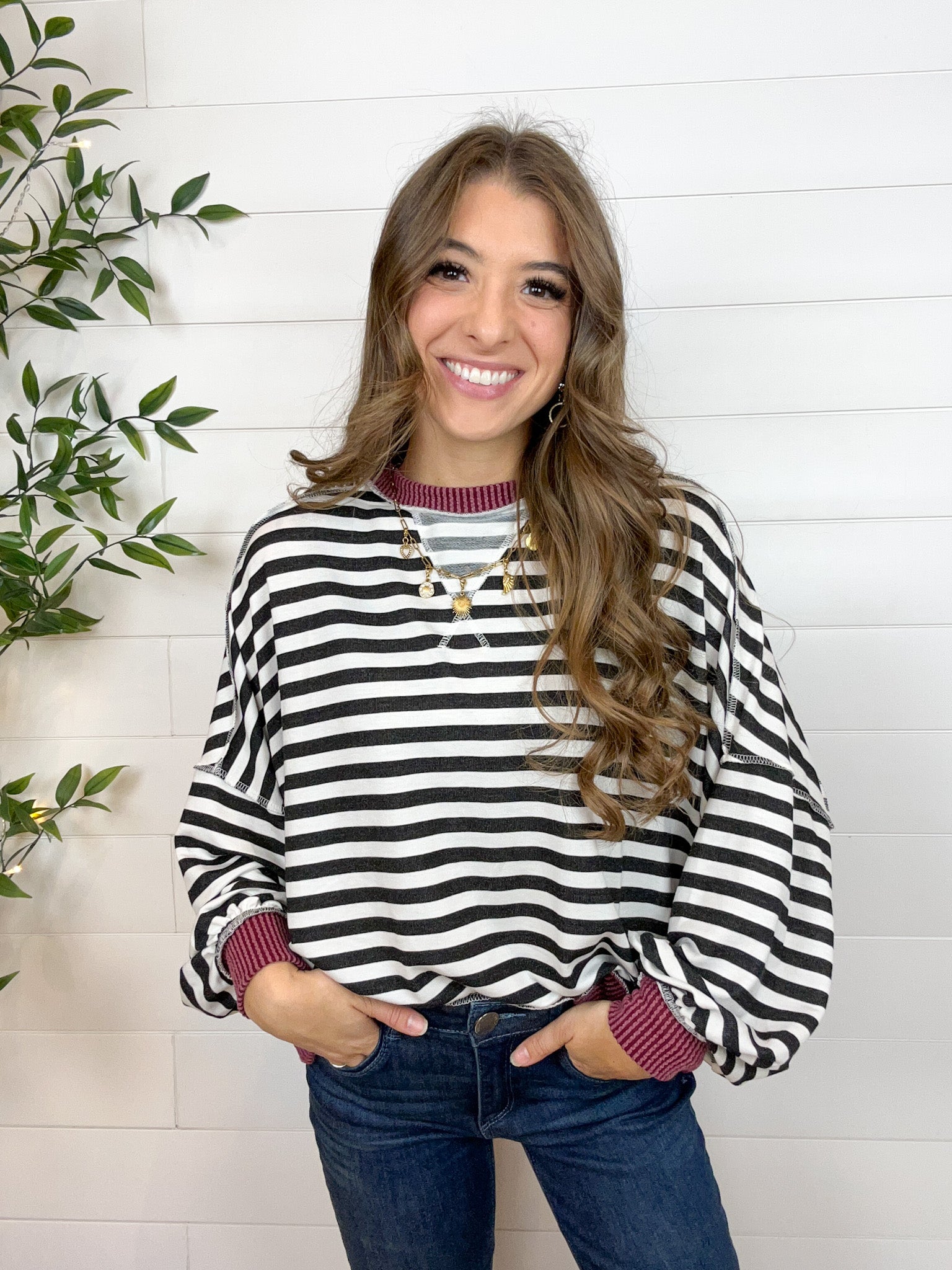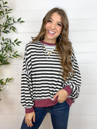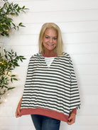 Slip into cozy-chic perfection with this Oversized Ribbed Hem Striped Pullover! The soft French terry knit and loose, drop-shoulder fit make it an instant favorite for laid-back days. With contrast ribbed trim at the neckline, cuffs, and hem — plus exposed seams for that effortlessly undone vibe — it’s the kind of top that looks cute without even trying.