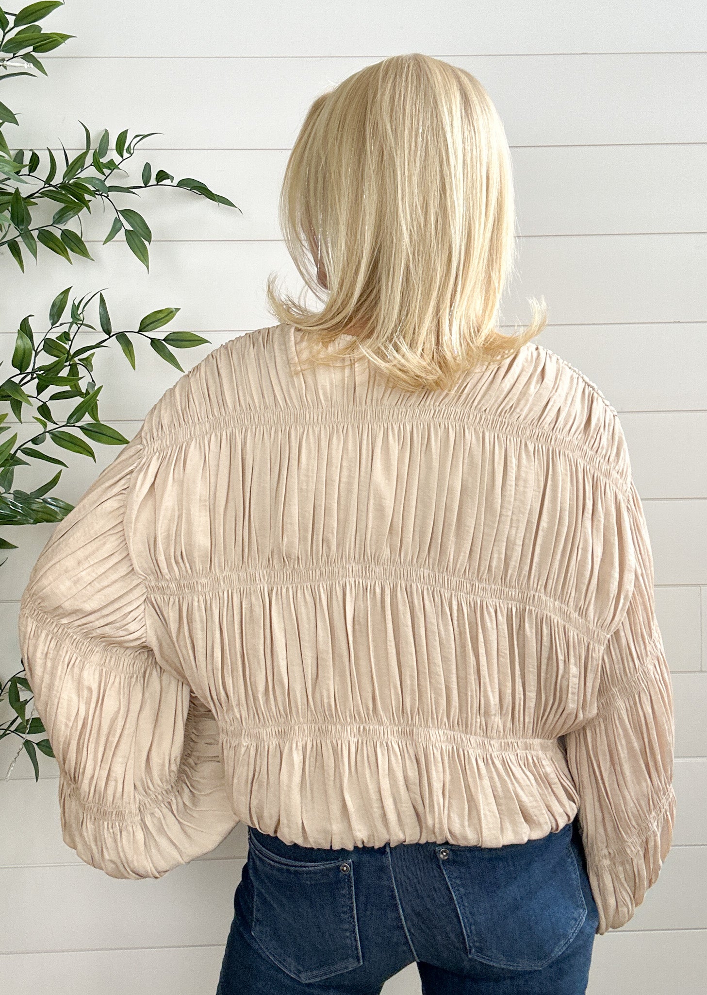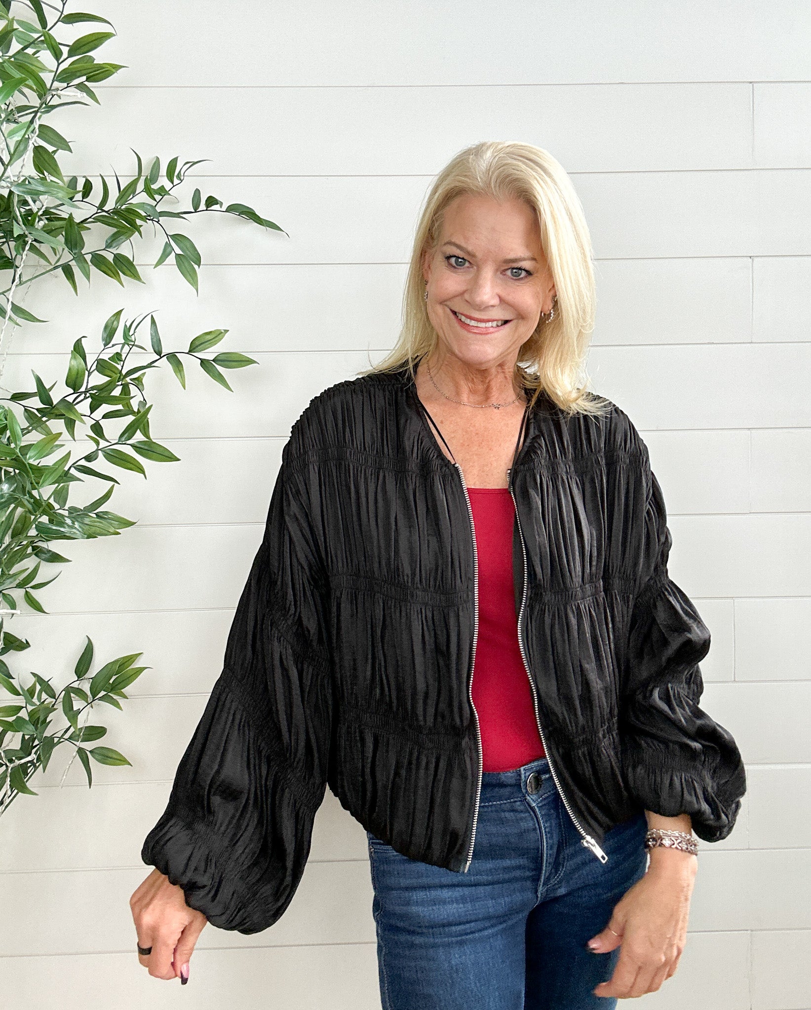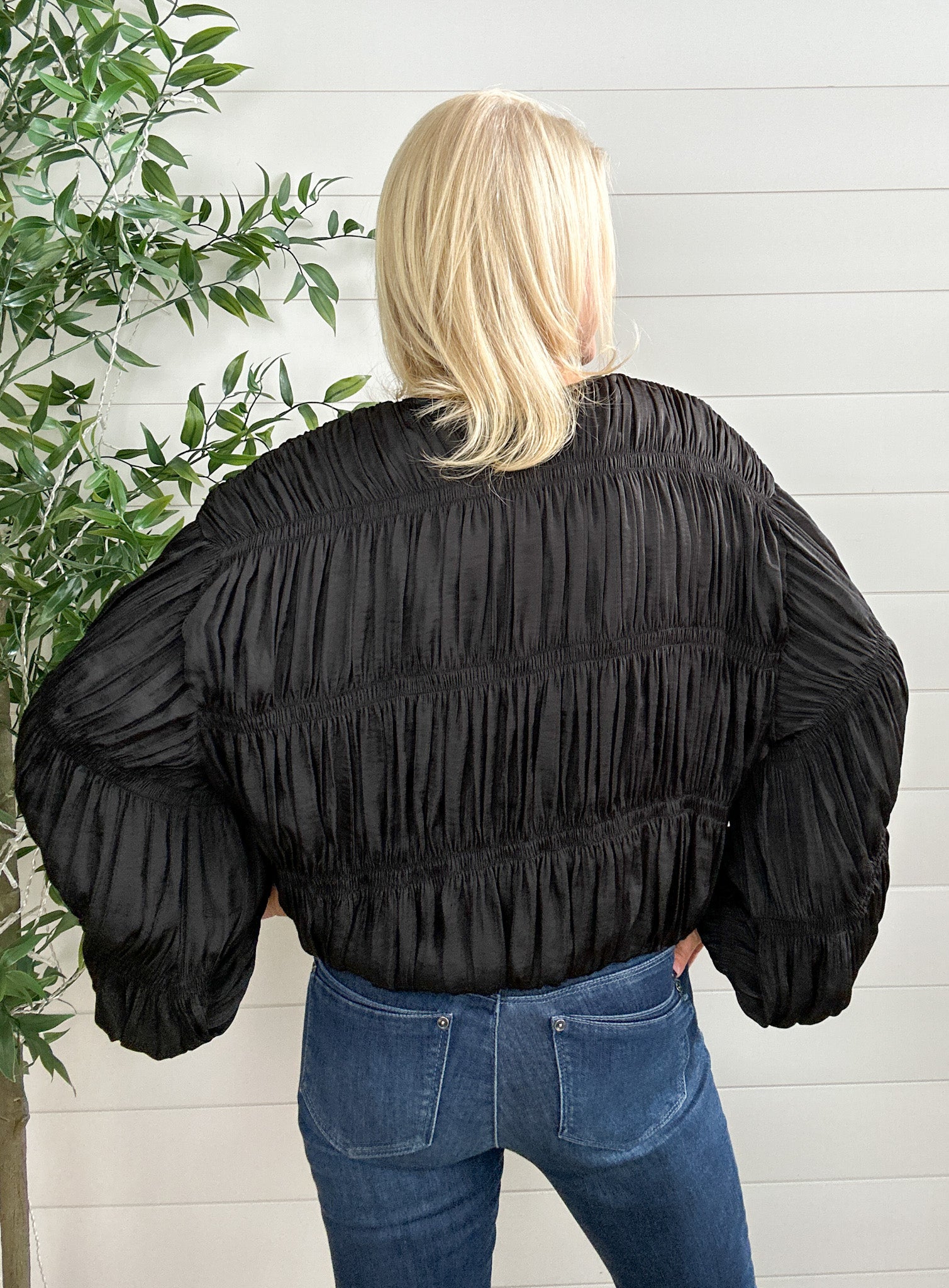 Give your outfit an instant glow-up with this dreamy Pleated Balloon Sleeve Jacket. Designed with horizontal pleated “stripes” across the body and sleeves, it brings texture, shine, and just the right amount of whimsy. The satin-y feel and bubble-hem poet sleeves make it a total standout—cute, chic, and absolutely outfit-making.