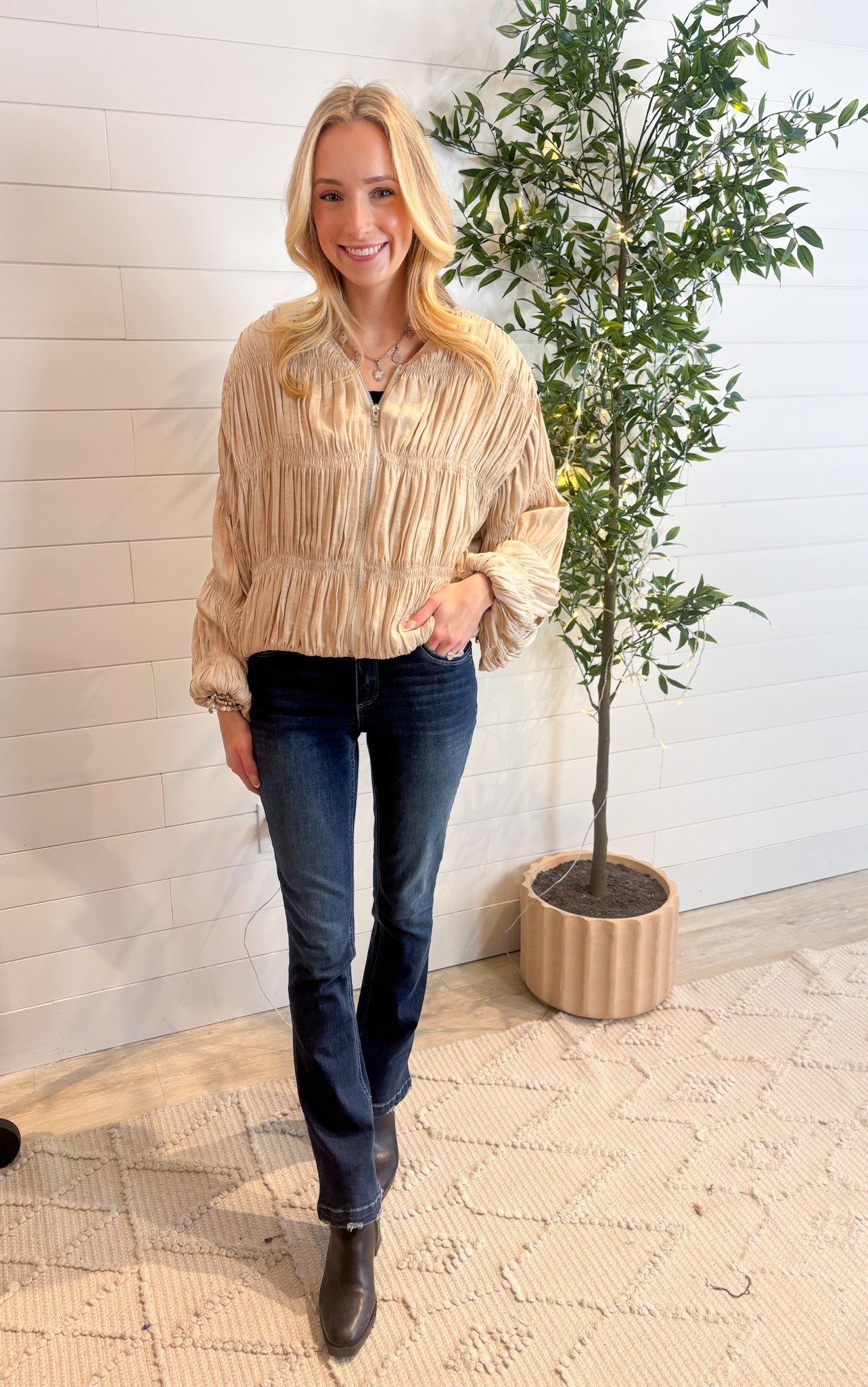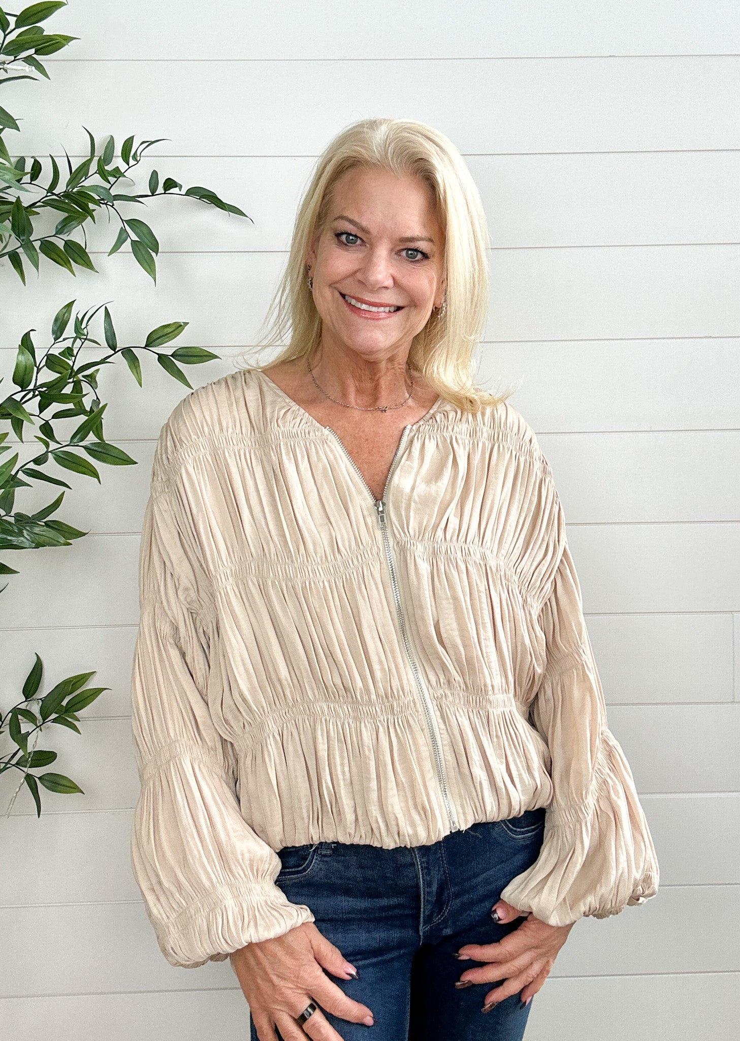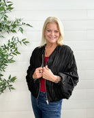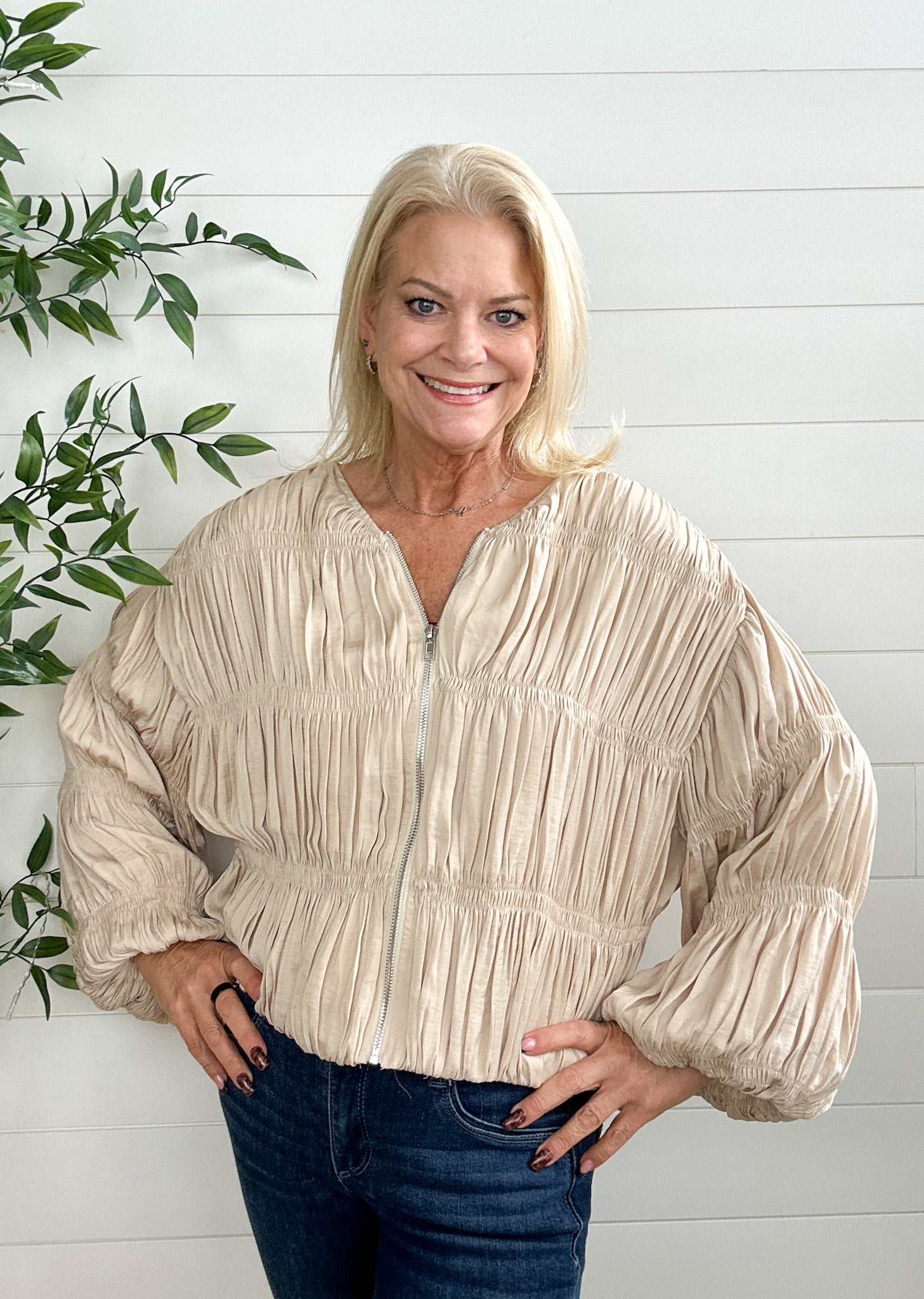 Give your outfit an instant glow-up with this dreamy Pleated Balloon Sleeve Jacket. Designed with horizontal pleated “stripes” across the body and sleeves, it brings texture, shine, and just the right amount of whimsy. The satin-y feel and bubble-hem poet sleeves make it a total standout—cute, chic, and absolutely outfit-making.