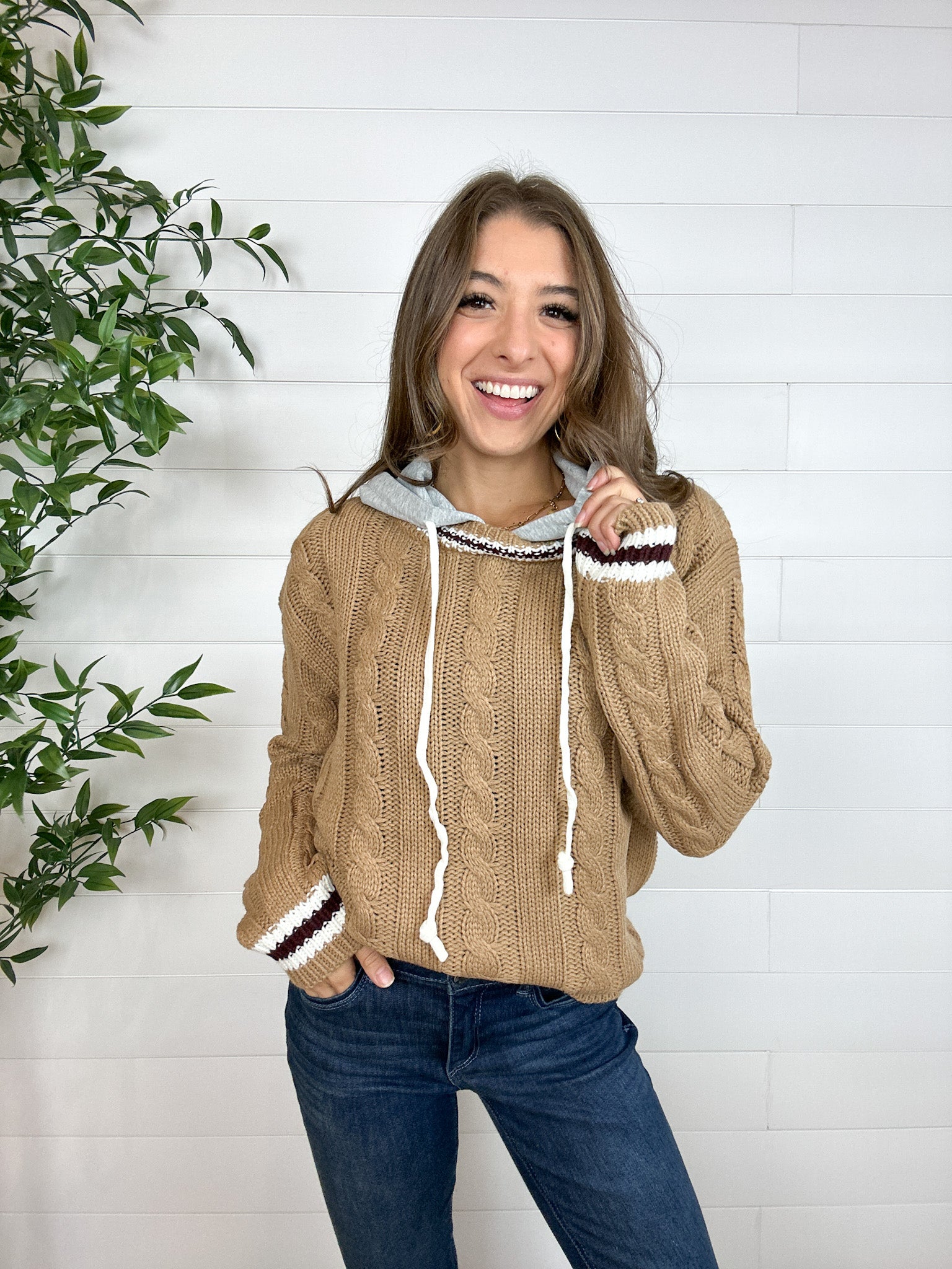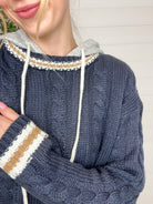 The Preppy Cable Knit Hoodie blends classic charm with casual cool. Featuring a heather grey hoodie-style hood and traditional cable knit body, this sweater is finished with varsity-inspired striping along the neckline, cuffs, and hem. With just the right amount of stretch, it’s the perfect mix of cozy and chic — whether you’re heading to brunch or just keeping it cute on a casual day out.