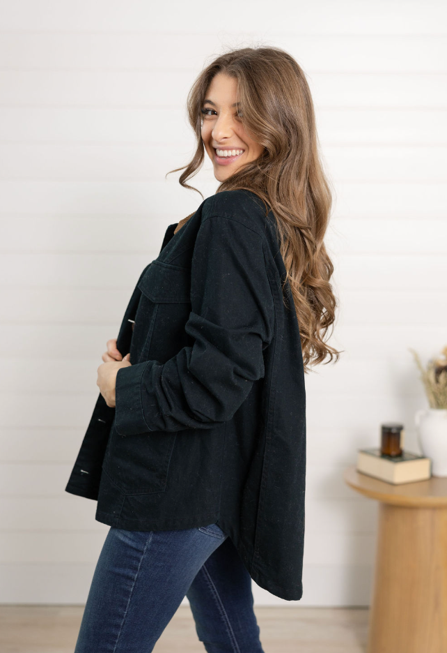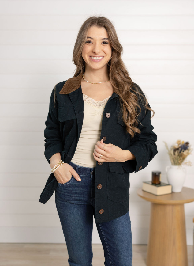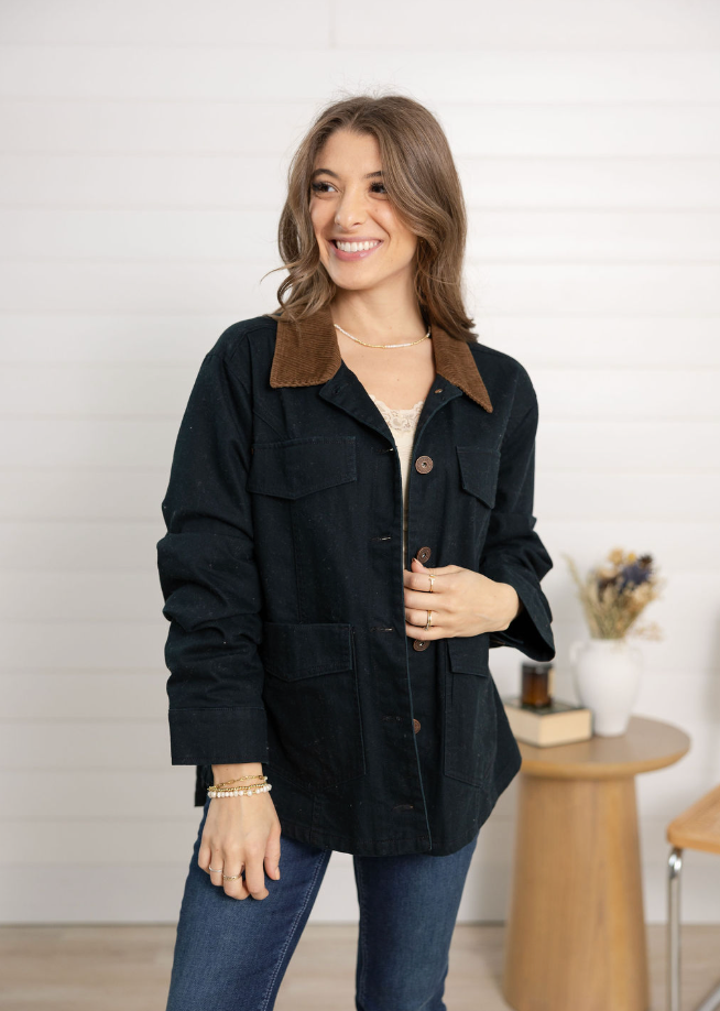 This button front barn jacket is the ultimate outfit topper. It features on-trend design details like three quarter ruched sleeves, a corduroy contrast collar, drop-in pockets, a hi-low hem, and a chic green cast undertone.