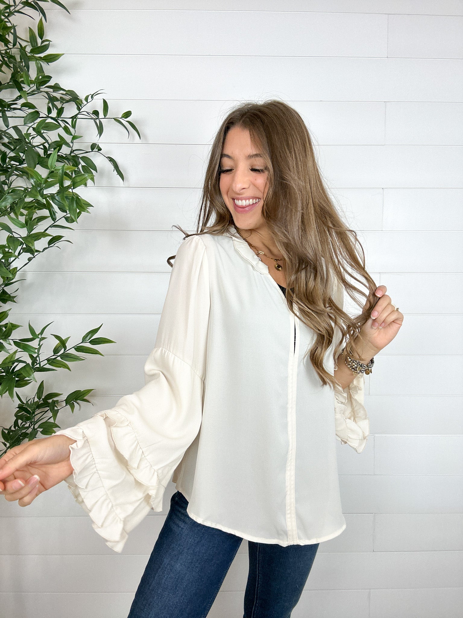 Soft, fluttery, and effortlessly elegant — the Romantic Ruffle Sleeve Top brings a dreamy touch to any outfit. With its flowing double ruffle sleeves and split V-neck framed in delicate gathers, this woven beauty captures the essence of femininity. The slightly sheer fabric and gentle drape make it a perfect pick for date nights, brunches, or any time you want to feel extra lovely.