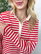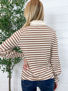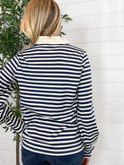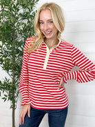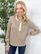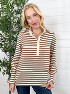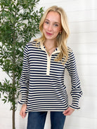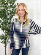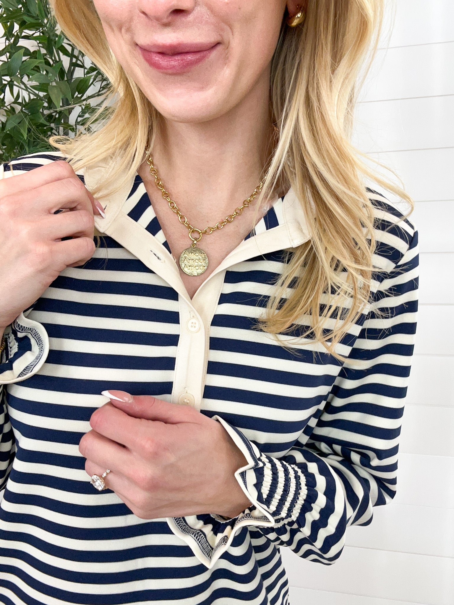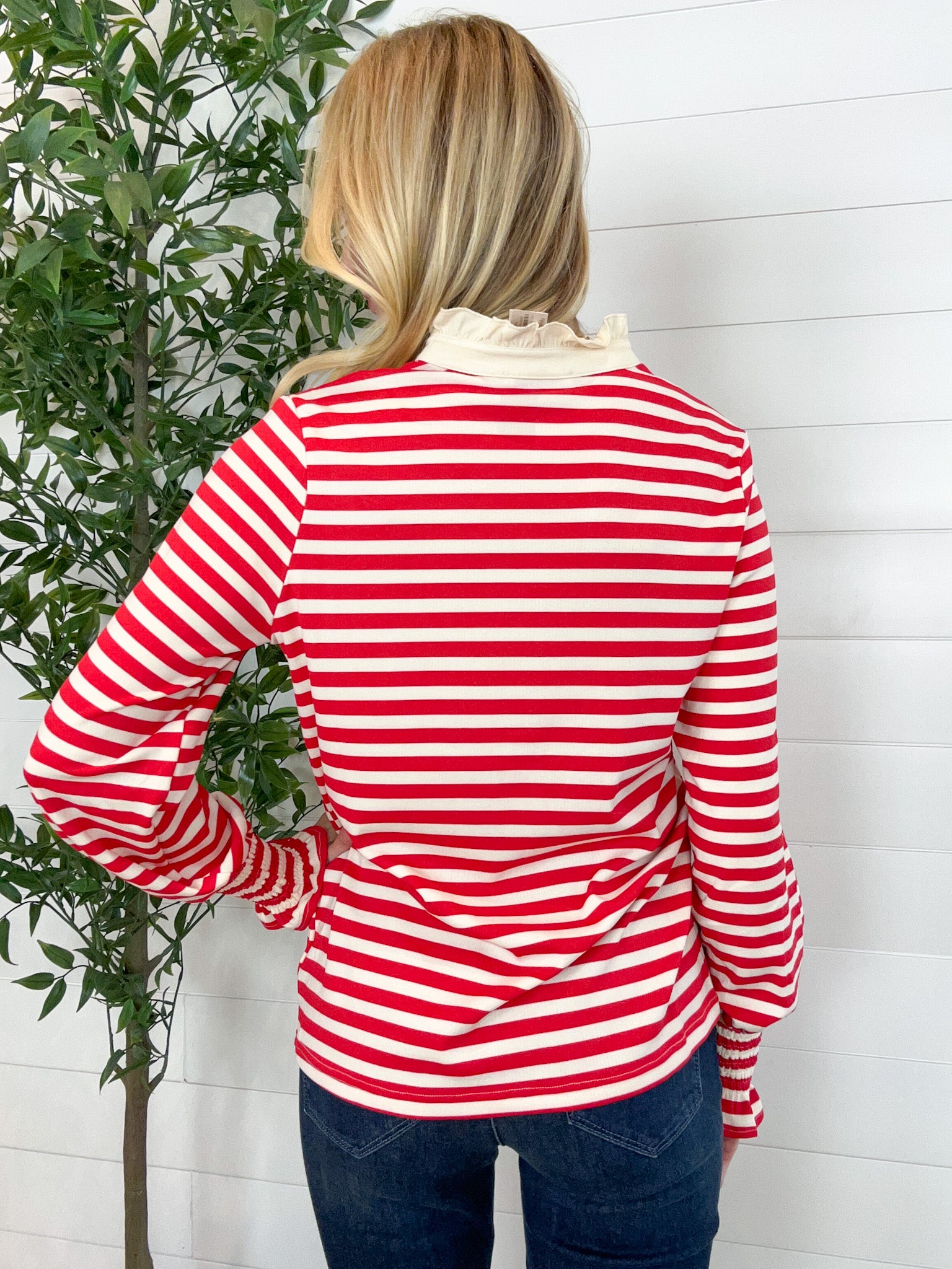 Our Ruffle Trim High Neck Striped Top blends everyday comfort with a dash of feminine charm. The soft, stretchy striped jersey keeps things casual, while the ruffled high neck and smocked cuffs add a pretty, polished finish. With its half-button front and flattering fit, it’s an easy piece to dress up or down all season long.