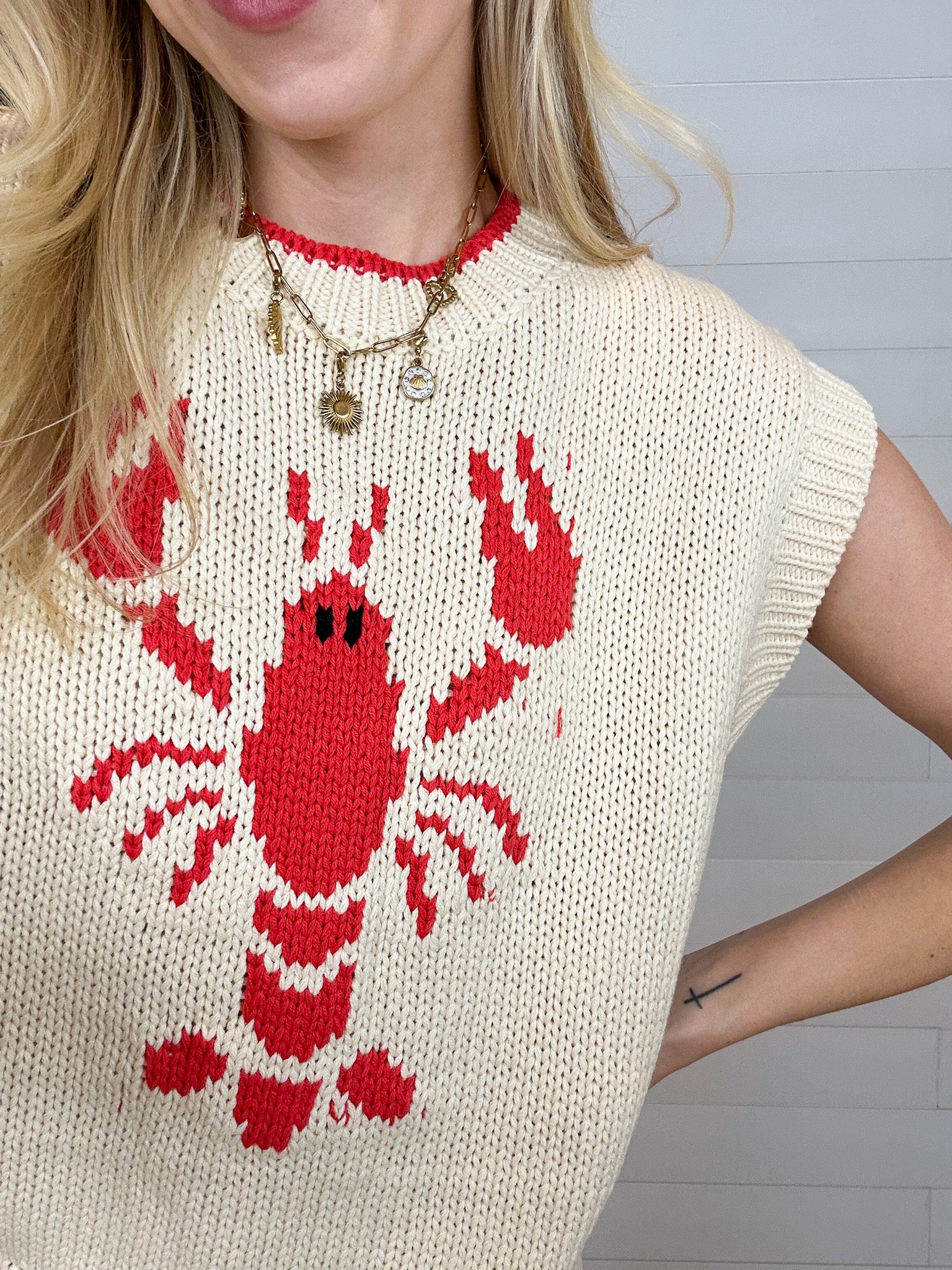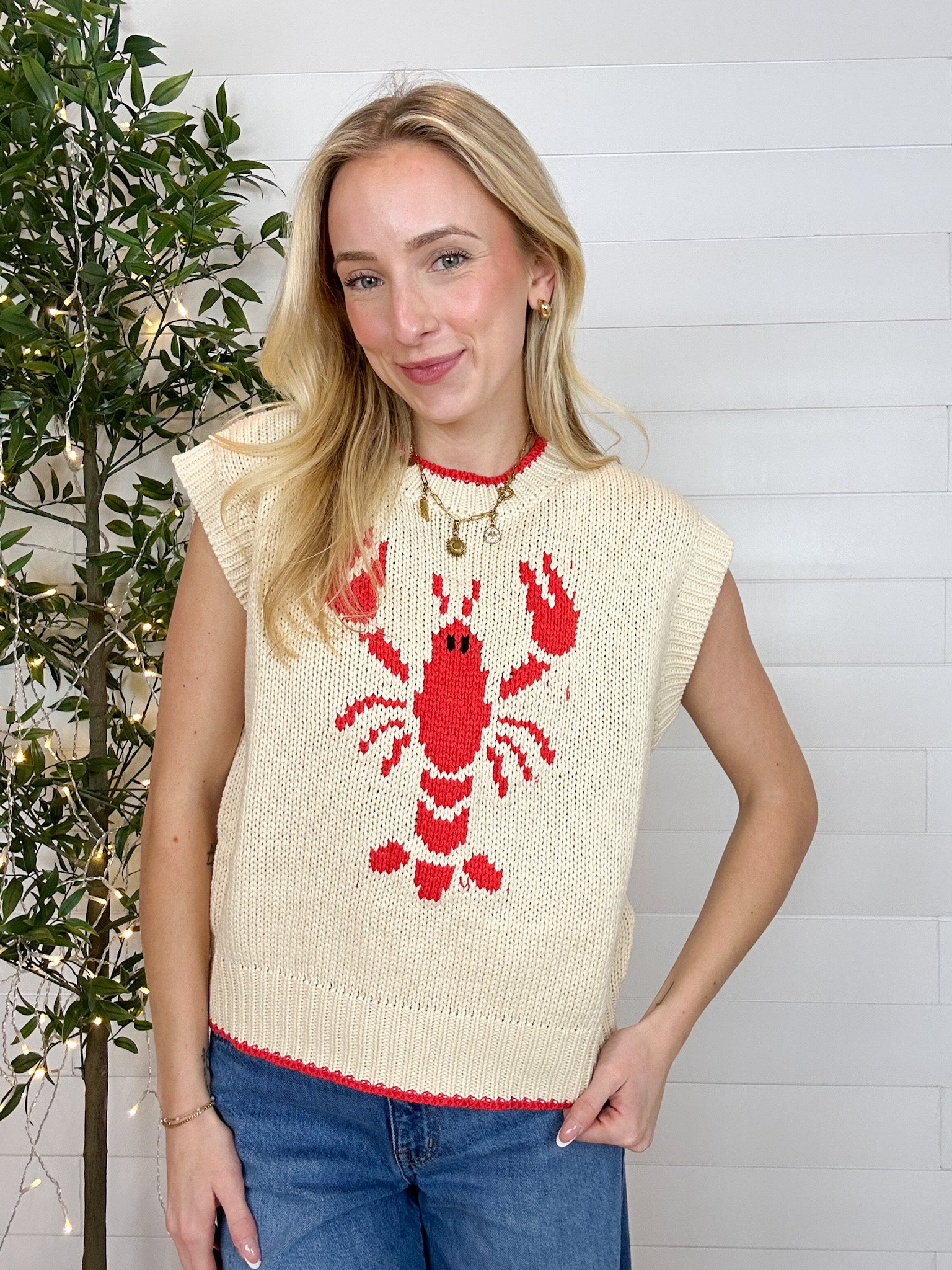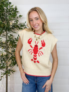 Meet the Sleeveless Lobster Sweater β the coastal-cute knit that brings instant personality to any outfit. With a bold jacquard lobster woven right into the front, this top gives you that charming, summer-by-the-shore vibe without ever trying too hard. Red piping along the neckline and hem adds a crisp, preppy pop, while the true-to-size fit makes it an easy piece to wear alone or layered over tees and button-downs.