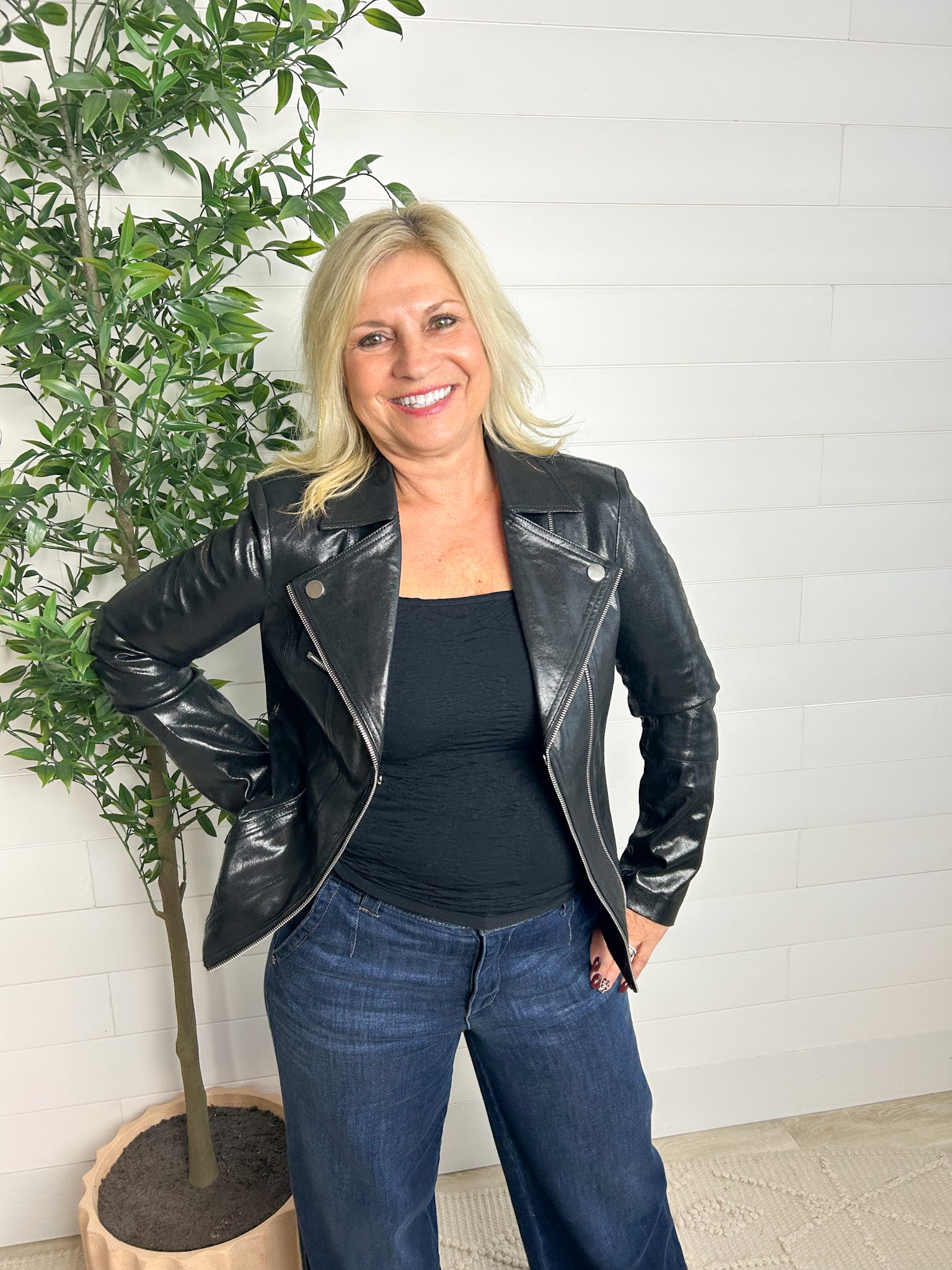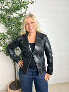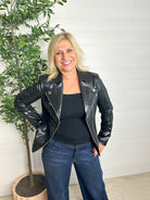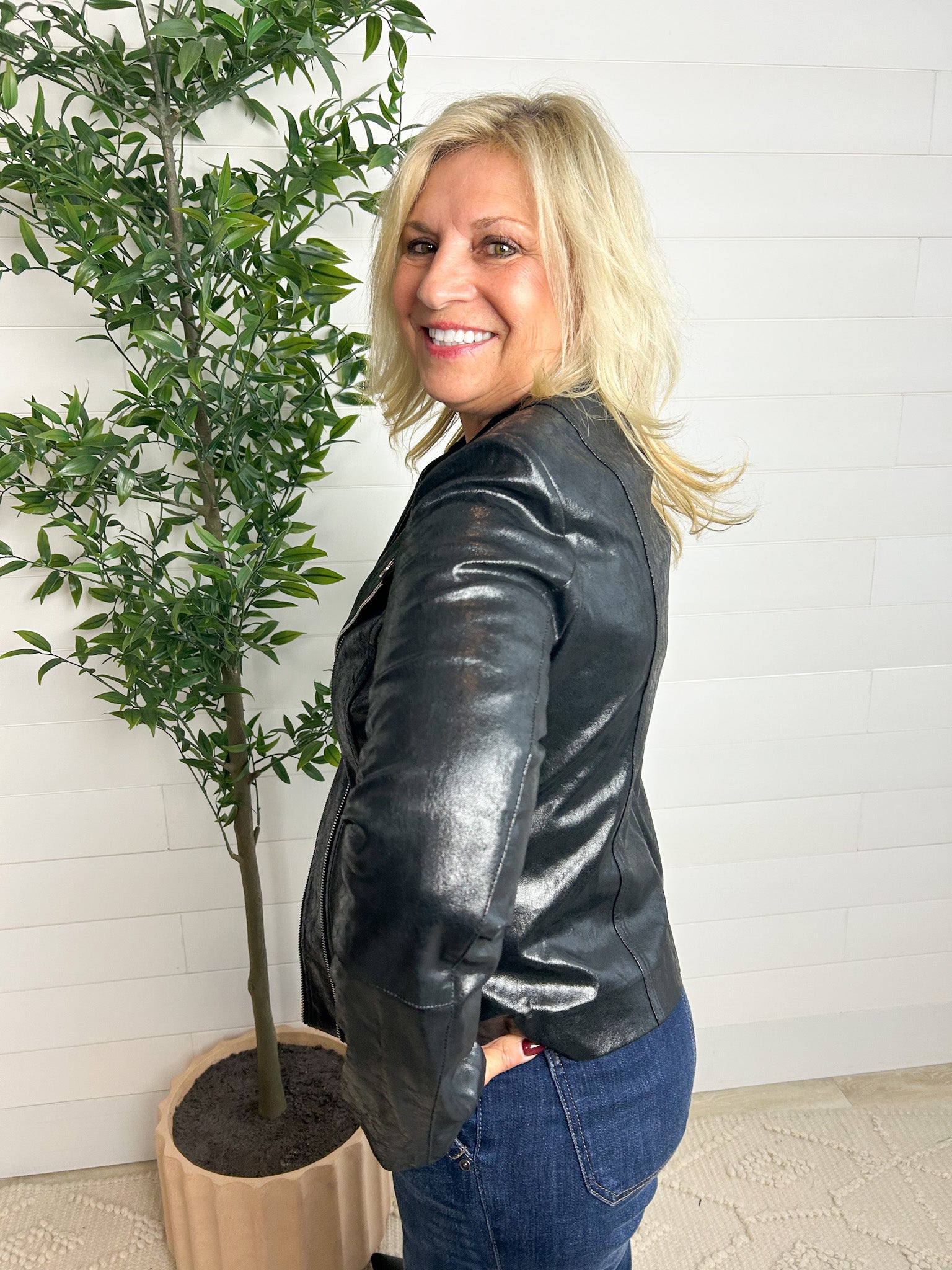 Turn heads in this metallic vegan leather moto jacket! Sleek, shiny, and effortlessly cool, it’s the perfect statement piece for elevating any outfit. The classic moto silhouette flatters every figure, while the zip-up front keeps it chic and streamlined. Layer over your favorite tee, dress, or blouse for instant edge and sparkle.