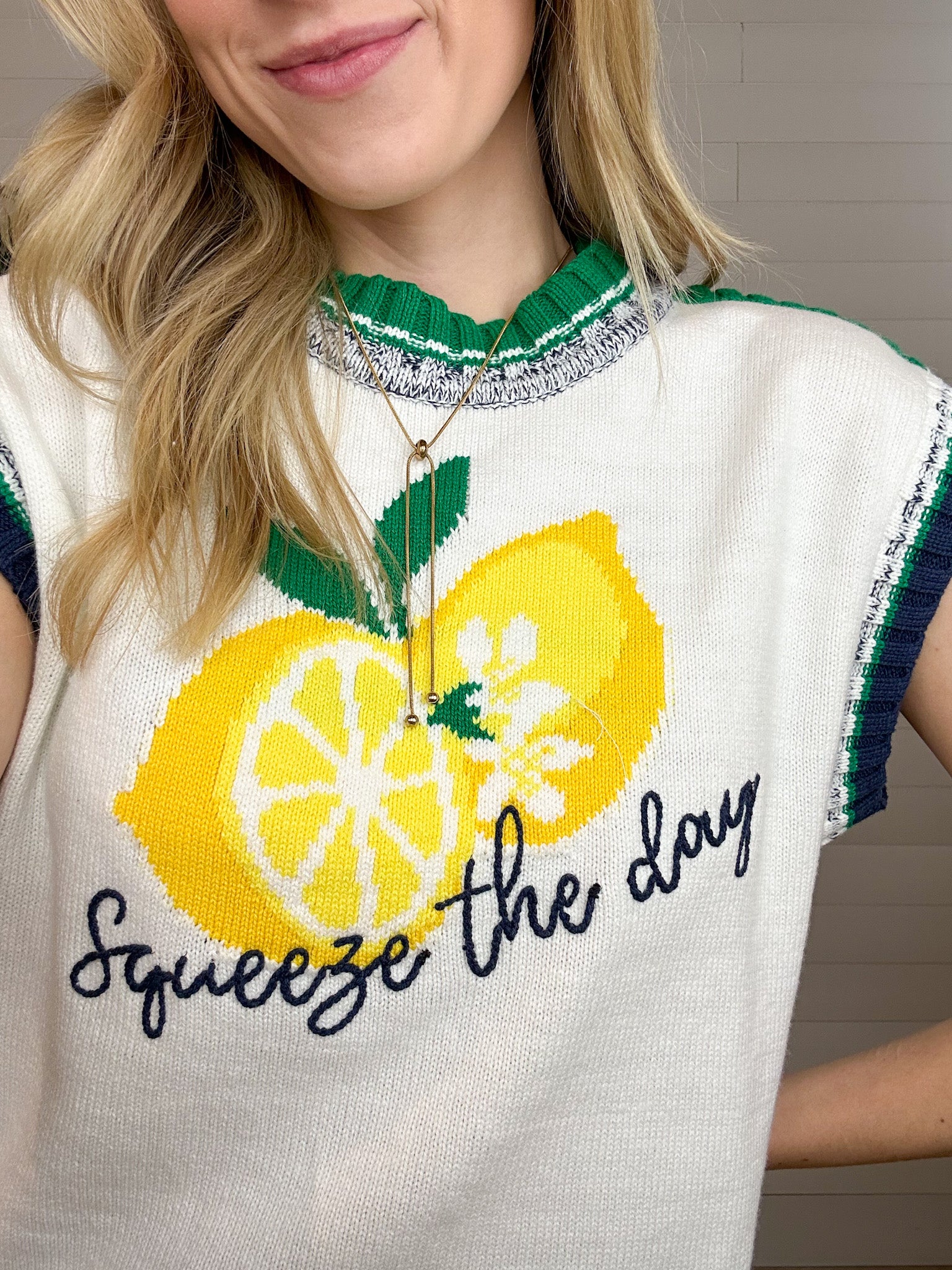 The “Squeeze the Day” Lemon Sweater Vest is pure feel-good style with a polished twist. Designed with a creamy knit body, this classic-length sweater vest features a cheerful intarsia lemon graphic paired with the embroidered phrase “Squeeze the Day” front and center. Navy and kelly green striped hems add a crisp, preppy finish that balances the playful design beautifully. Soft, lightweight, and endlessly layerable, it’s the perfect piece to brighten up your everyday looks.