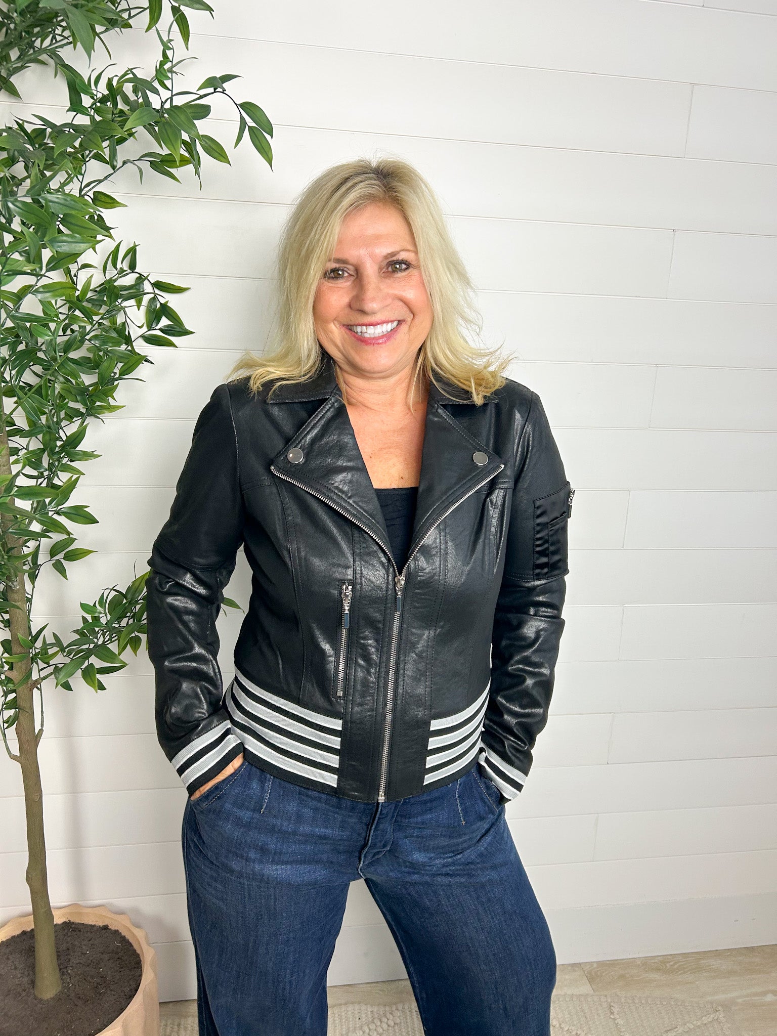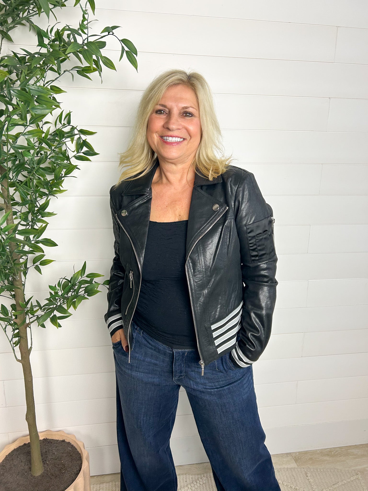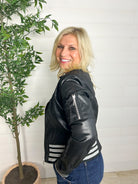 A little sporty, a little edgy—this jacket brings the best of both worlds. Made from sleek vegan leather, it’s cut like a classic moto but finished with striped knit trim at the waist and cuffs (with a touch of silver lurex sparkle). The lapels pop with silver button detailing, while a mini satin pocket on the sleeve adds a luxe, unexpected twist. It’s the jacket that goes from downtown cool to campus chic in a snap.