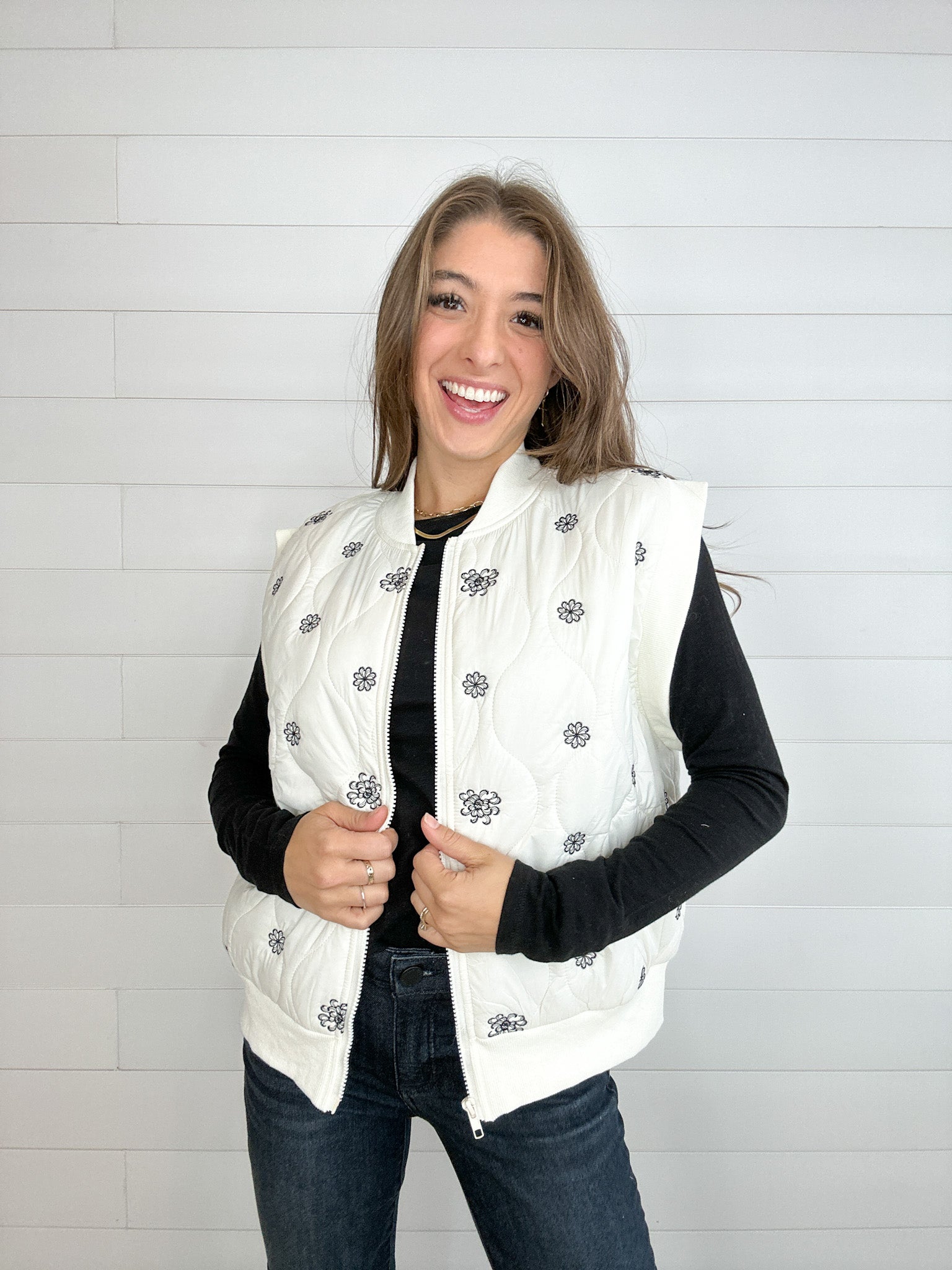 Stay cozy without sacrificing style in this wispy floral embroidered puffer vest! Lightly quilted and fully lined for comfort, it features delicate, scattered floral embroidery that adds a soft, whimsical touch. The zip-up front makes layering easy, while the contrast details give a subtle nod to playful design.